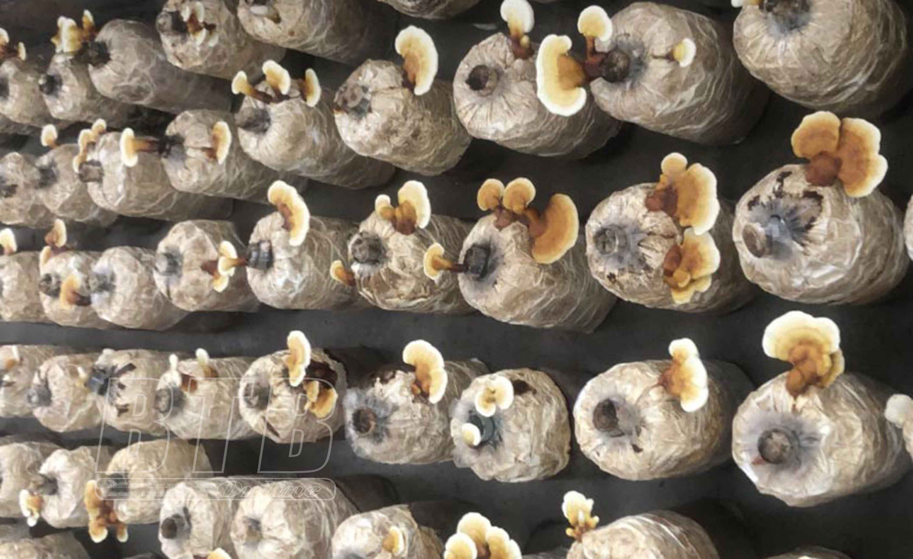 Những phôi nấm linh chi được nông dân Trần Văn Doanh chăm sóc cho chất lượng cao.