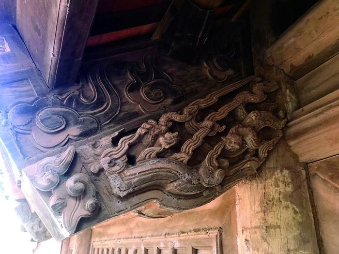 Bên trong, hệ thống khung gỗ được liên kết các vì theo kiểu chồng rường giá chiêng, thượng tam hạ tứ.