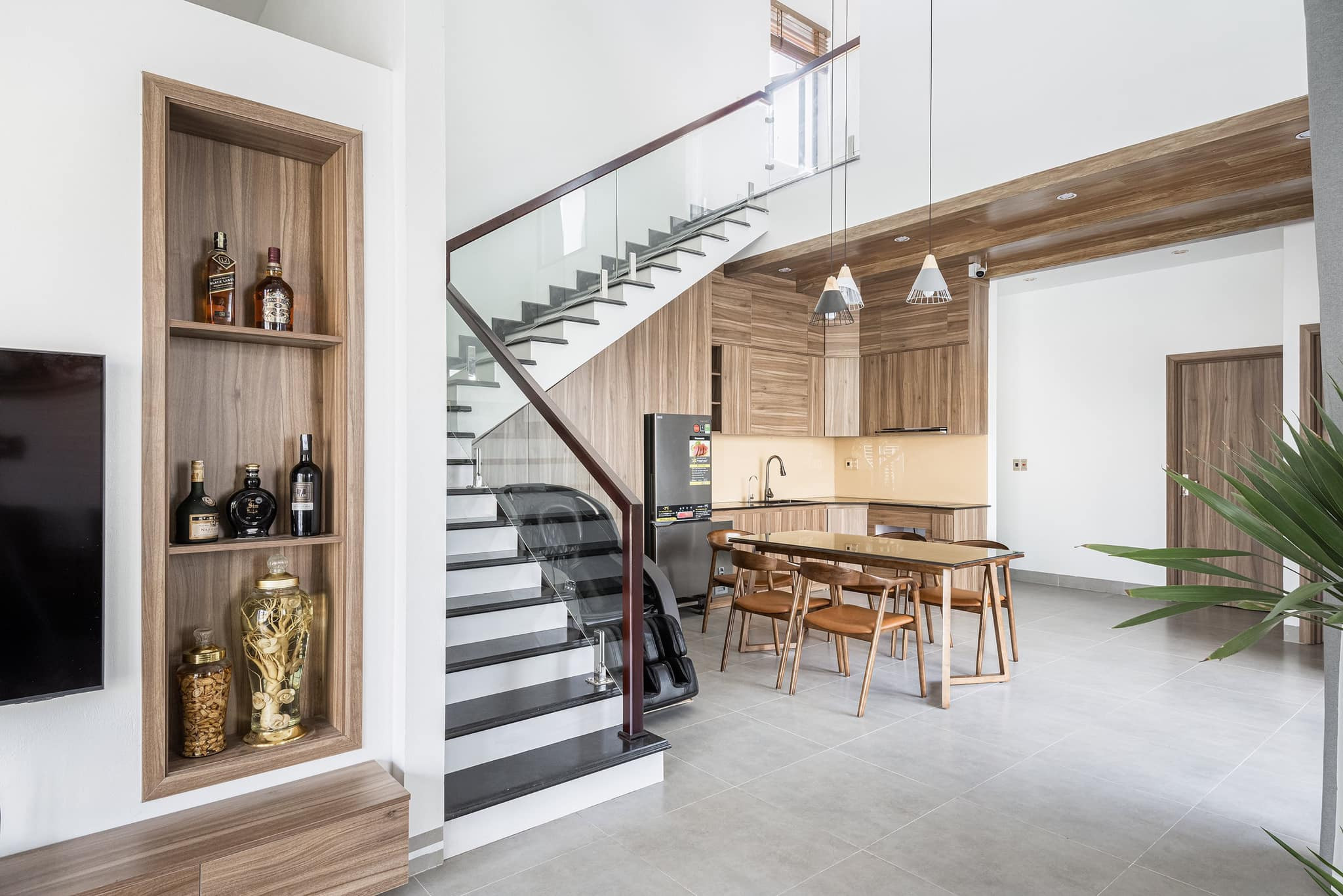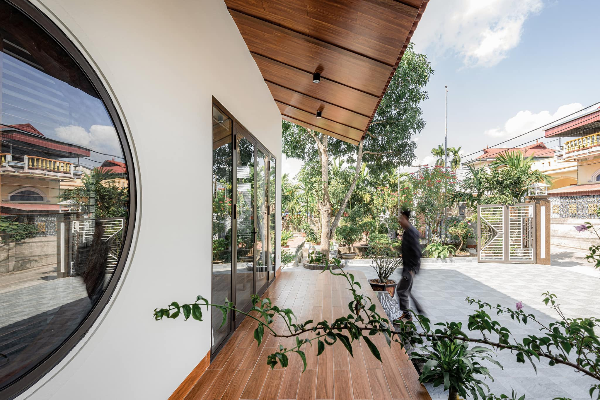 Hiên nhà là nơi gia chủ dùng để tiếp khách. Ở trên có mái che mưa, che nắng. Nhóm thi công đã sử dụng vật liệu gạch giả gỗ có độ nhám cao để lát hiên. Vòm cũng được sơn giả gỗ theo ý tưởng tiết kiệm thay vì ốp gỗ, giúp căn nhà đẹp và ấn tượng.