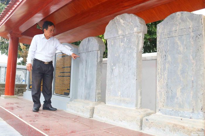 Trong nhà bia trước sân nhà thờ có 3 tấm bia đá cổ được lập vào các năm 1834, 1853, 1859, Theo ông Nguyễn Tư An - người trông coi di tích nhà thờ họ Nguyễn Hữu, đây là 3 tấm bia chữ Hán nói về nhà thờ và các vị tổ tiên của dòng họ. Ngày trước bia dựng giữa trời, mới đây dòng họ đã xây dựng nhà bia để bảo vệ. Bên cạnh 3 tấm bia cổ là 3 bản dịch của những tấm bia này.