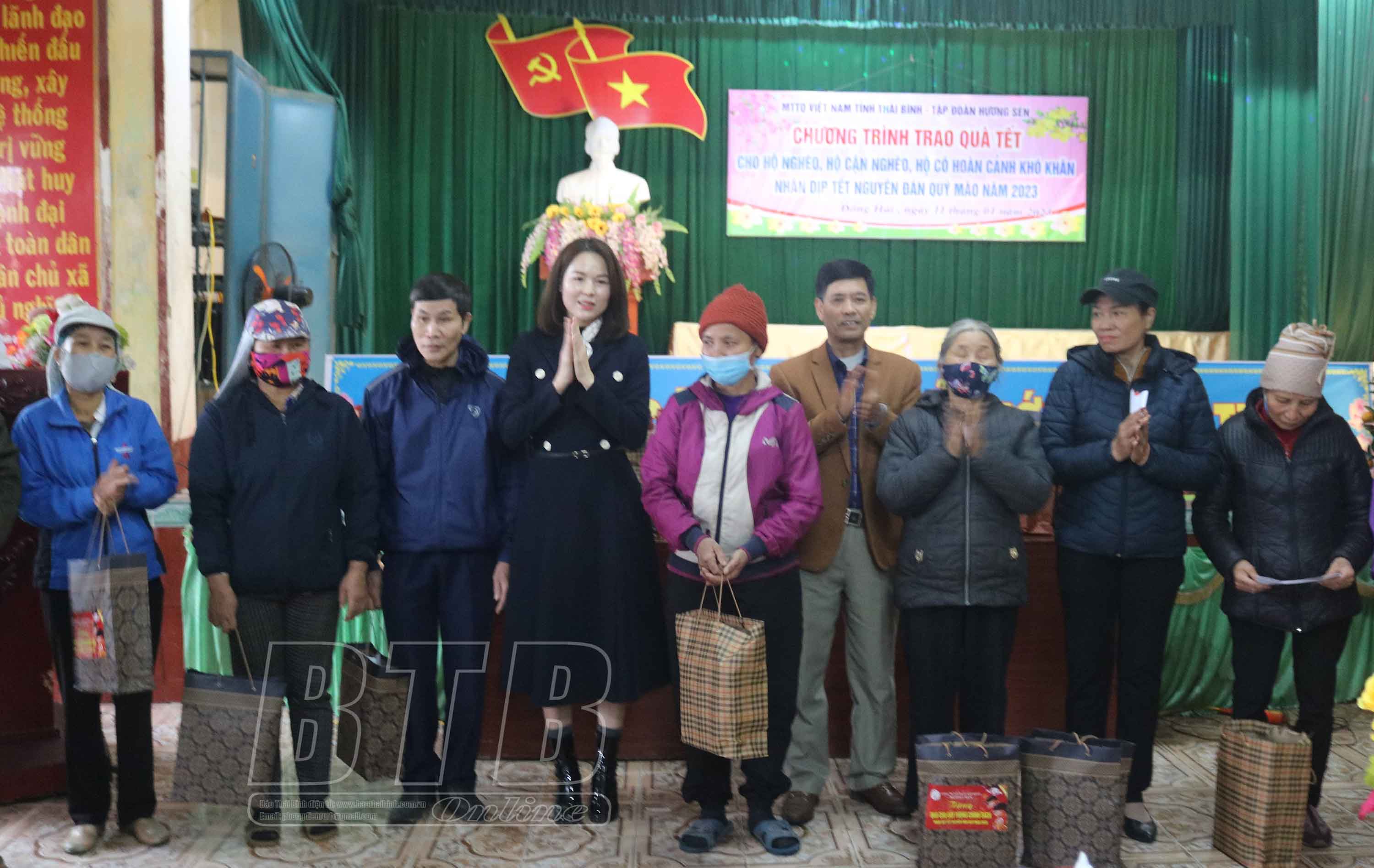Sáng ngày 11/1, Ủy ban MTTQ tỉnh phối hợp với Hiệp hội Doanh nghiệp tỉnh, Công ty Cổ phần Tập đoàn Hương Sen, Công ty TNHH Sợi dệt Hương Sen Comfor trao 100 suất quà, mỗi suất trị giá 400.000 đồng với tổng trị giá 40 triệu đồng cho các hộ nghèo, cận nghèo, người cao tuổi trên địa bàn xã Đông Hải (Quỳnh Phụ).