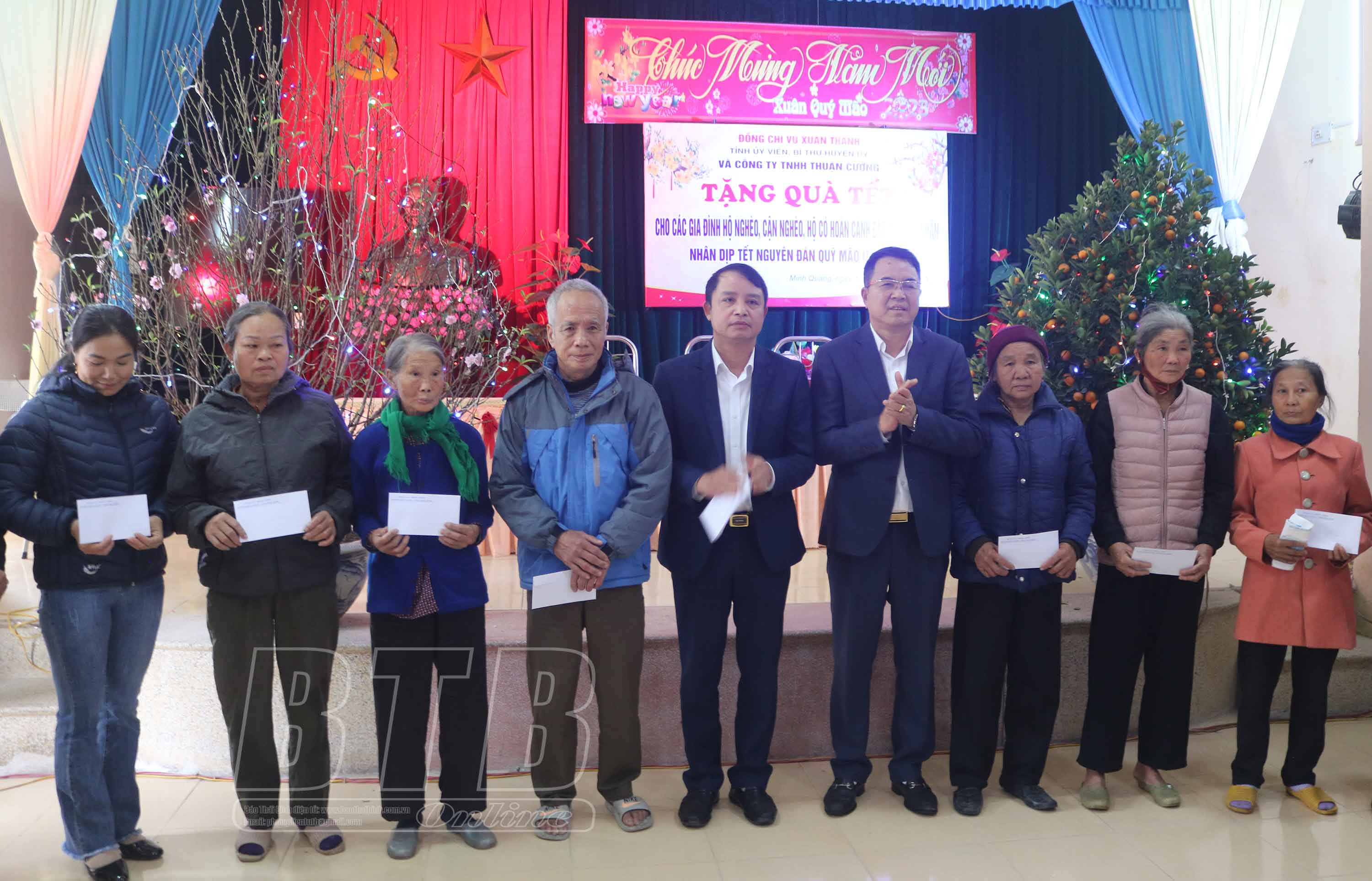 Lãnh đạo huyện Kiến Xương và Công ty TNHH Thương mại tổng hợp Thuận Cường trao quà cho hộ nghèo của xã Minh Quang.