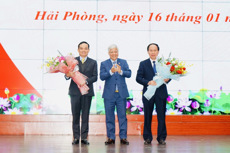 Đồng chí Đỗ Văn Chiến, Bí thư Trung ương Đảng, Chủ tịch Ủy ban Trung ương MTTQ Việt Nam tặng hoa chúc mừng đồng chí Trần Lưu Quang, Phó Thủ tướng Chính phủ và đồng chí Lê Tiến Châu, tân Bí thư Thành ủy Hải Phòng.