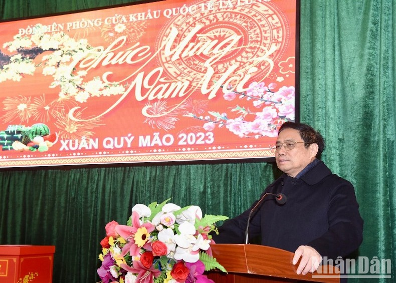 Phát biểu ý kiến, Thủ tướng Phạm Minh Chính gửi tới các cán bộ, chiến sĩ Bộ đội Biên phòng trên cả nước nói chung, Đồn Biên phòng Cửa khẩu quốc tế Tà Lùng nói riêng và các đại biểu lời thăm hỏi chân tình và lời chúc năm mới tốt đẹp nhất.