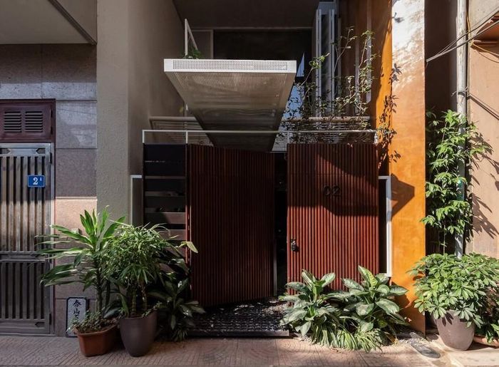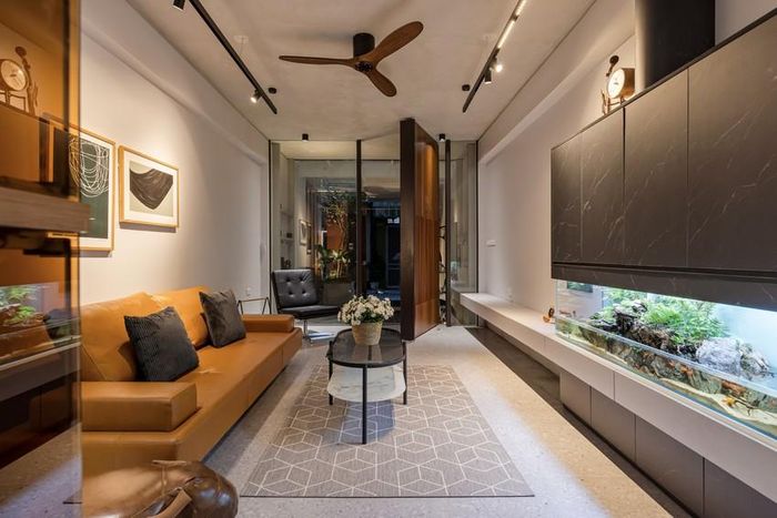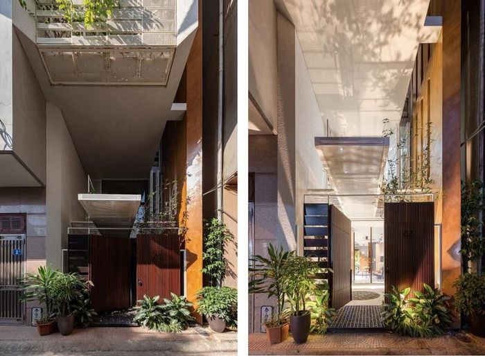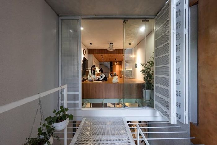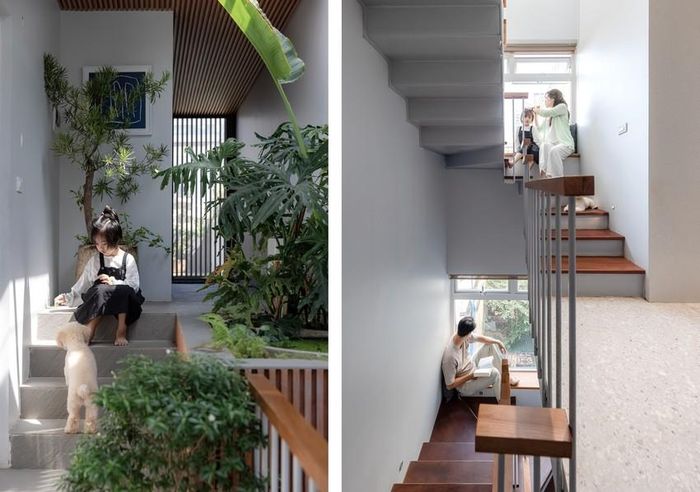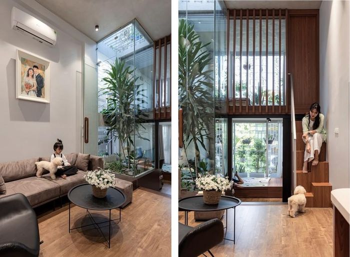 Giếng trời nhỏ giúp lưu thông không khí ở cuối nhà và tạo tạo hiệu ứng thị giác cho mặt tiền và giao thông trong nhà.