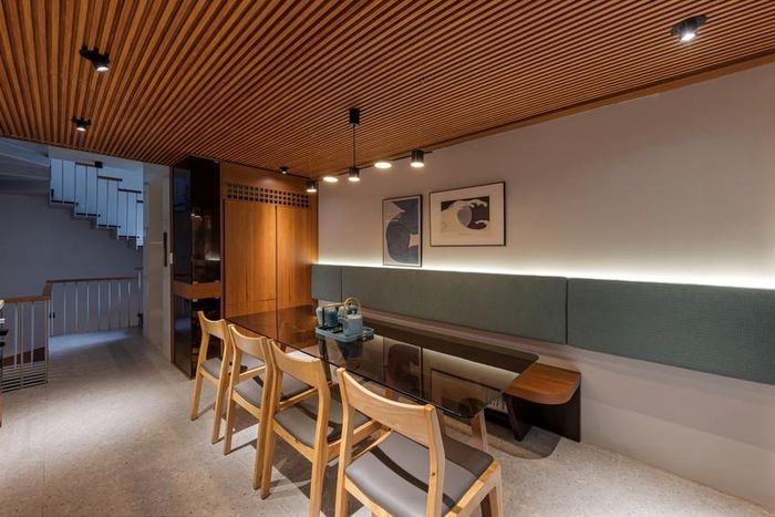Kiến trúc sư A4 Architects thiết kế nhà có không gian sinh hoạt chung khá rộng dành cho đại gia đình vào những dịp lễ tết. Toàn bộ cây xanh ở các tầng trên được sử dụng làm lớp vỏ ngoài của ngôi nhà.