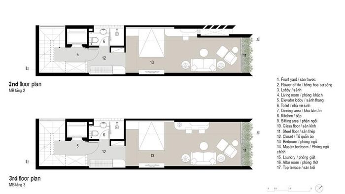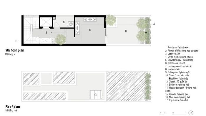 Với hạn chế về chiều ngang hẹp, trục giao thông chính, thang máy, cầu thang giếng trời được đưa về cuối nhà.