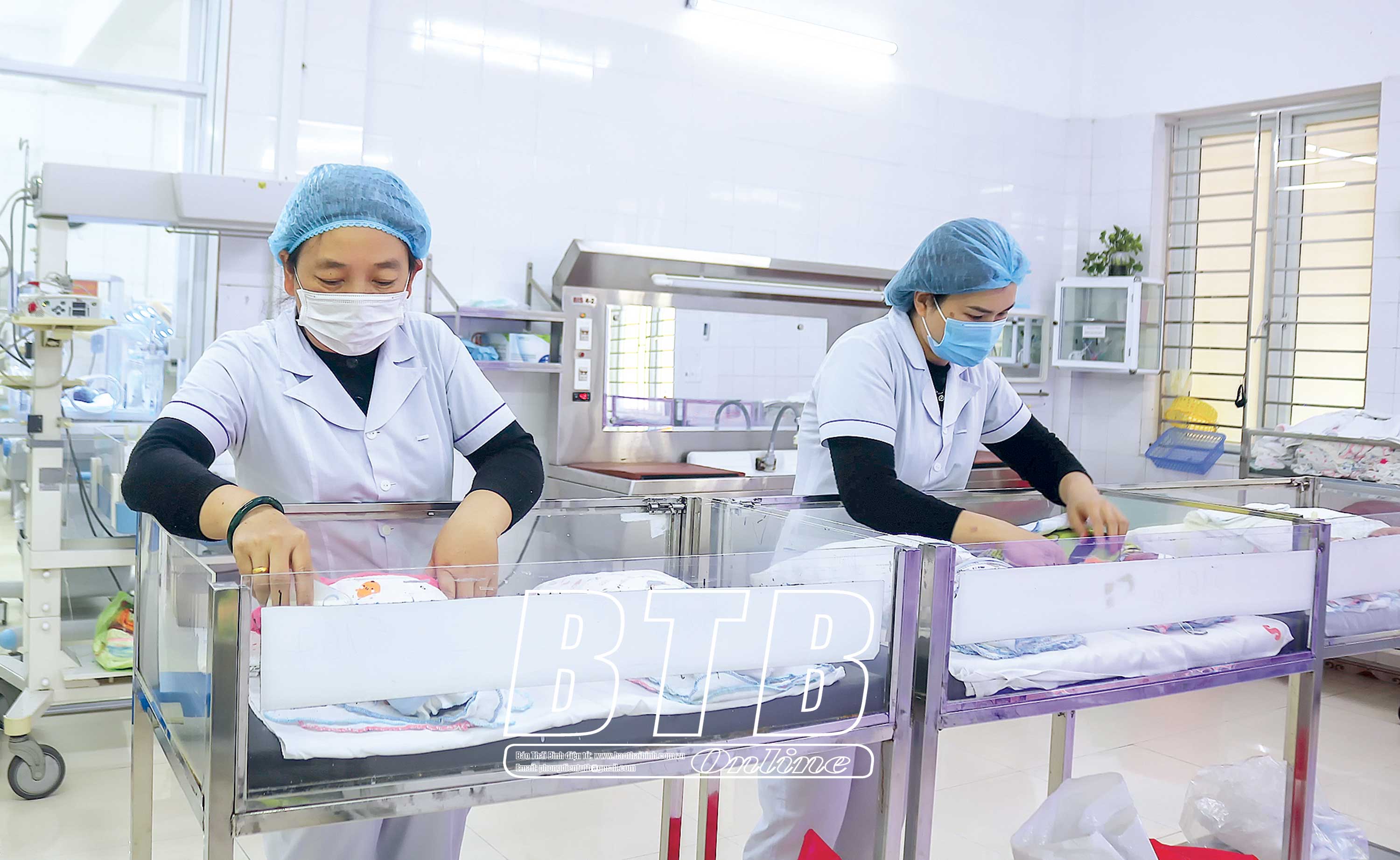 Các bác sĩ, nhân viên y tế Bệnh viện Phụ sản Thái Bình chăm sóc trẻ sơ sinh.