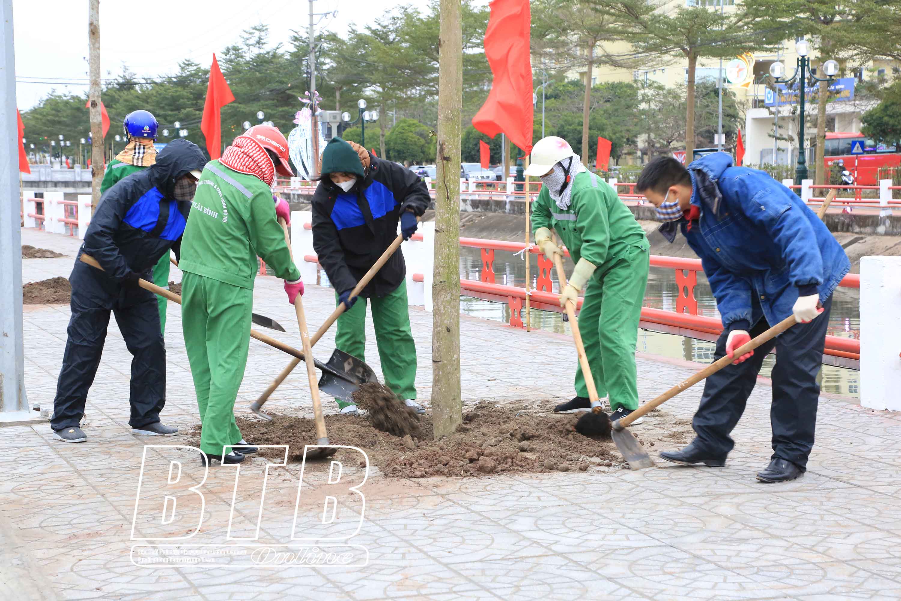 Công nhân Công ty Cổ phần Môi trường và Công trình đô thị Thái Bình gia trồng cây ngay sau lễ phát động.