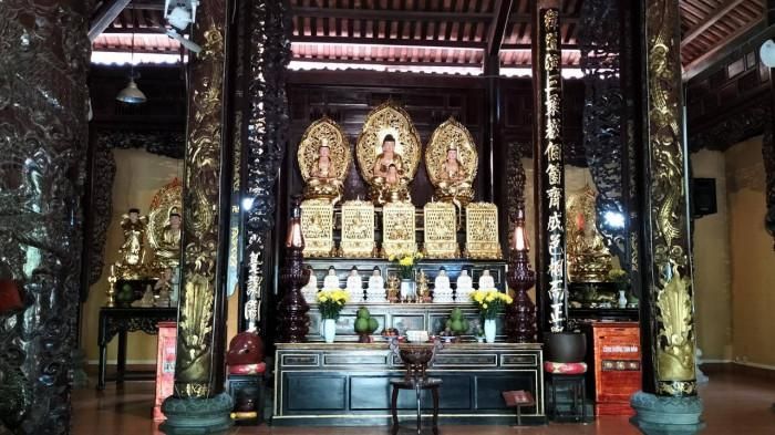 Chùa là tổng thể các công trình kiến trúc lớn nhỏ, được bố trí chặt chẽ, cân đối. Phía trước là Chánh điện, phía sau là sân Thiên tịnh và ngôi nhà Hậu tổ (thờ gia tiên và cô Hai Ngó, người sáng lập ra ngôi chùa).