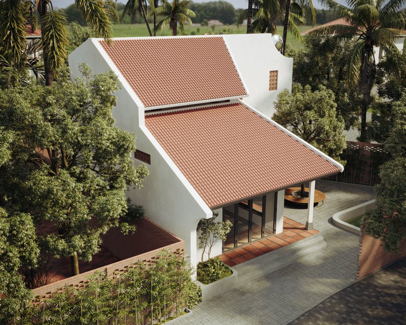 Phối cảnh mô hình ngôi nhà với mái ngói đỏ, dốc để thoát nước mưa. Hệ thống ánh sáng, gió trời được phân bố đều thông qua các cửa sổ, ô thoáng.