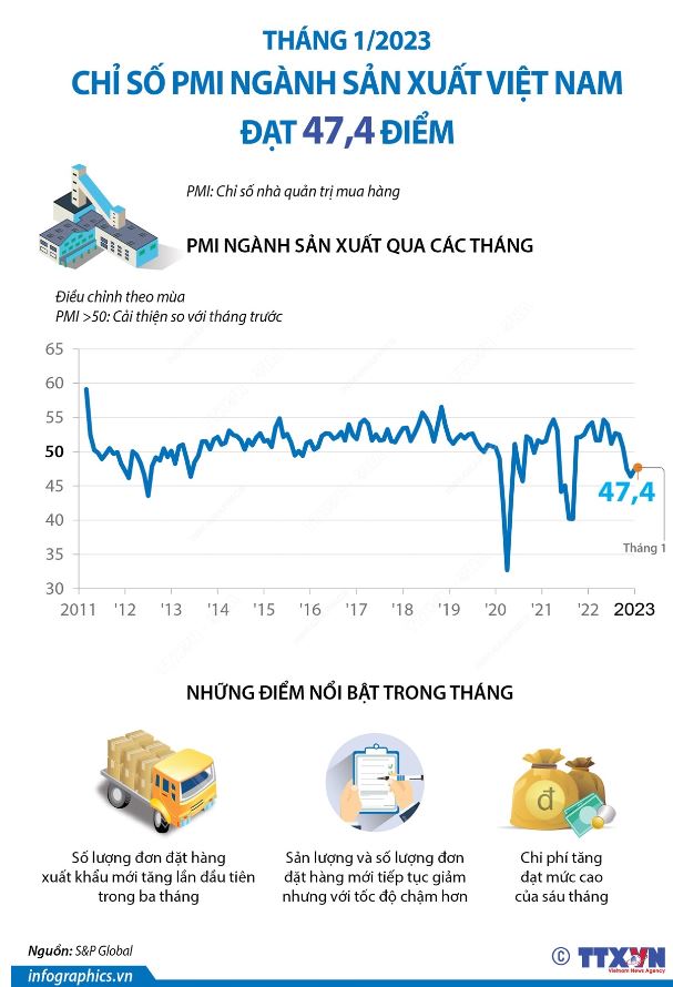 Tại báo cáo Chỉ số nhà quản trị mua hàng (PMI) tháng 1/2023 cho thấy, Chỉ số PMI ngành sản xuất Việt Nam đạt 47,4 điểm trong tháng 1/2023, tăng so với mức 46,4 điểm trong tháng 12/2022.