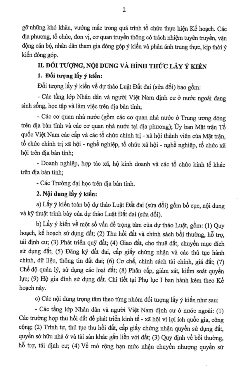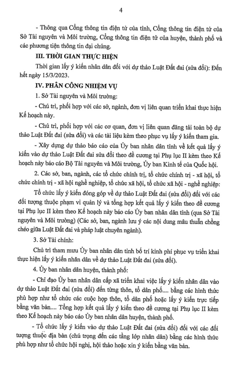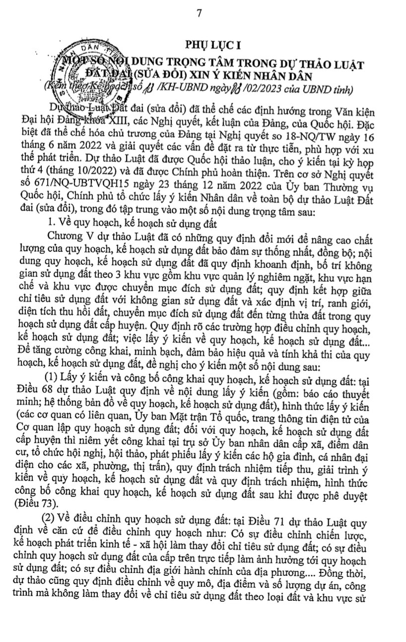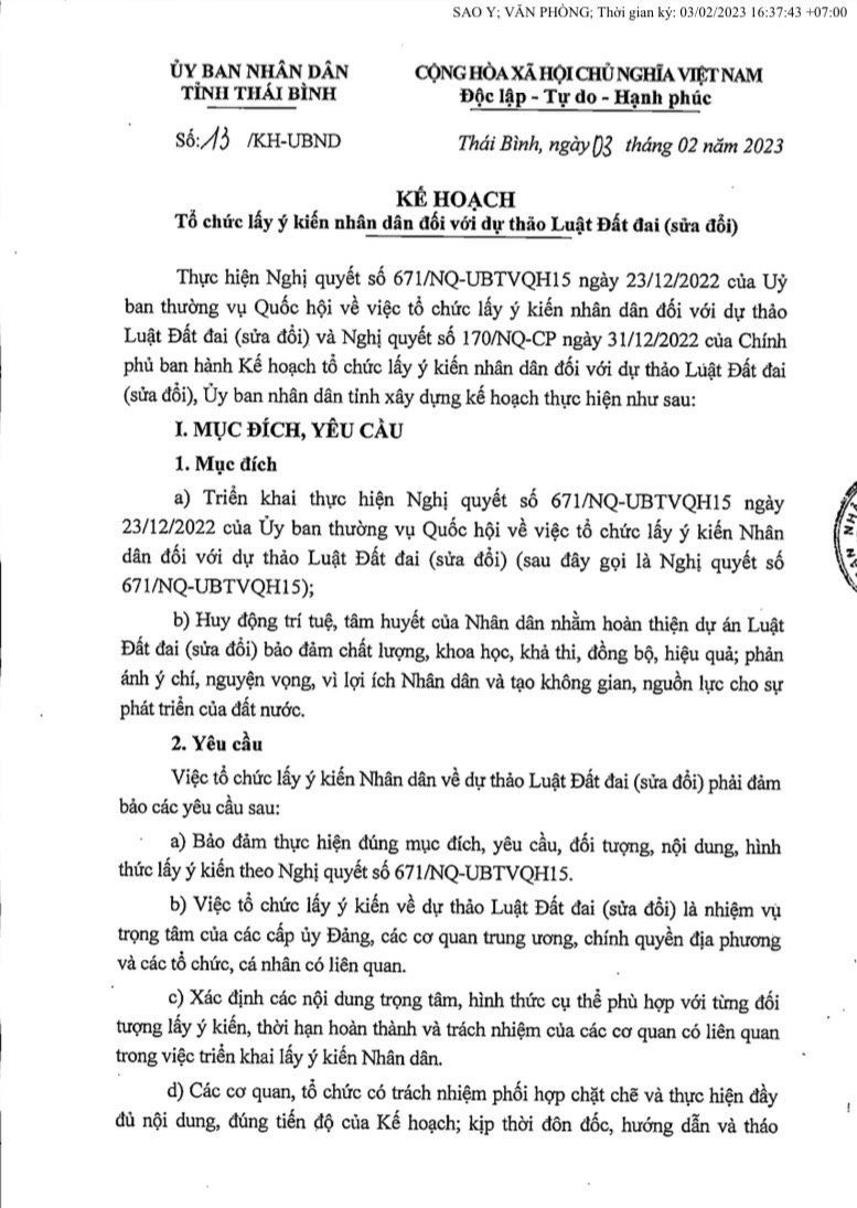 Ngày 3/2/2023, UBND tỉnh Thái Bình có Kế hoạch số 13/KH-UBND về việc tổ chức lấy ý kiến nhân dân đối với dự thảo Luật Đất đai (sửa đổi).