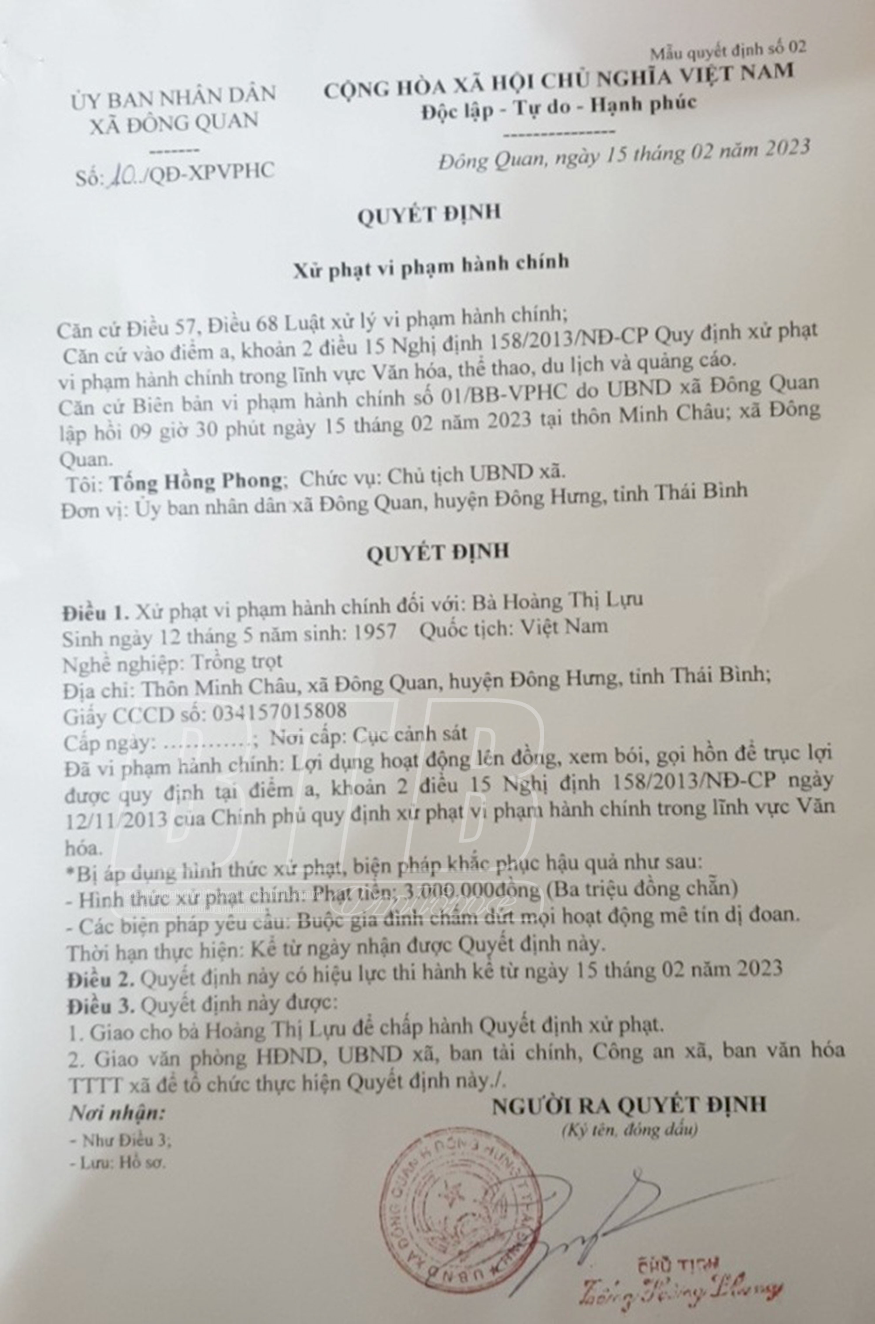 Chủ tịch UBND xã Đông Quan (Đông Hưng) vừa ra quyết định xử phạt bà Hoàng Thị Lựu vì hành vi lợi dụng hoạt động lên đồng, xem bói, gọi hồn để trục lợi.