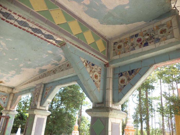 Các nghệ nhân Khmer đã khéo léo tận dụng chén, đĩa bằng gốm sứ để trang trí các bức tường, cột tháp, tạo nên một công trình kiến trúc hài hòa, ấn tượng