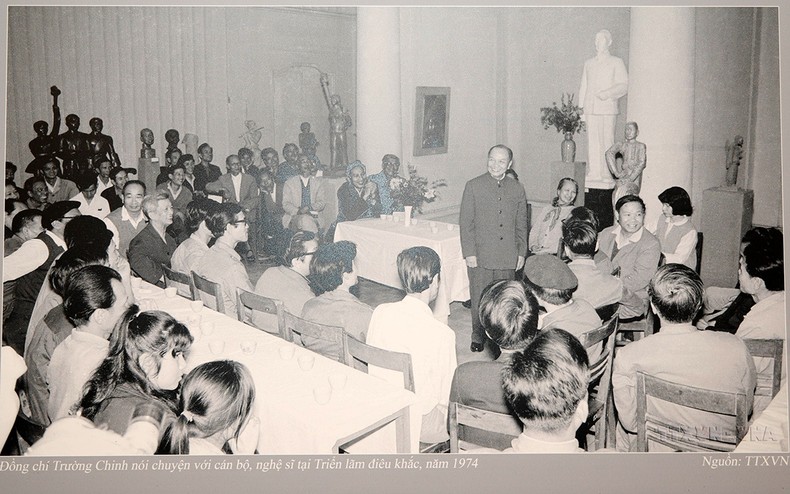 Hình ảnh đồng chí Trường Chinh nói chuyện với cán bộ, nghệ sĩ tại Triển lãm điêu khắc năm 1974.