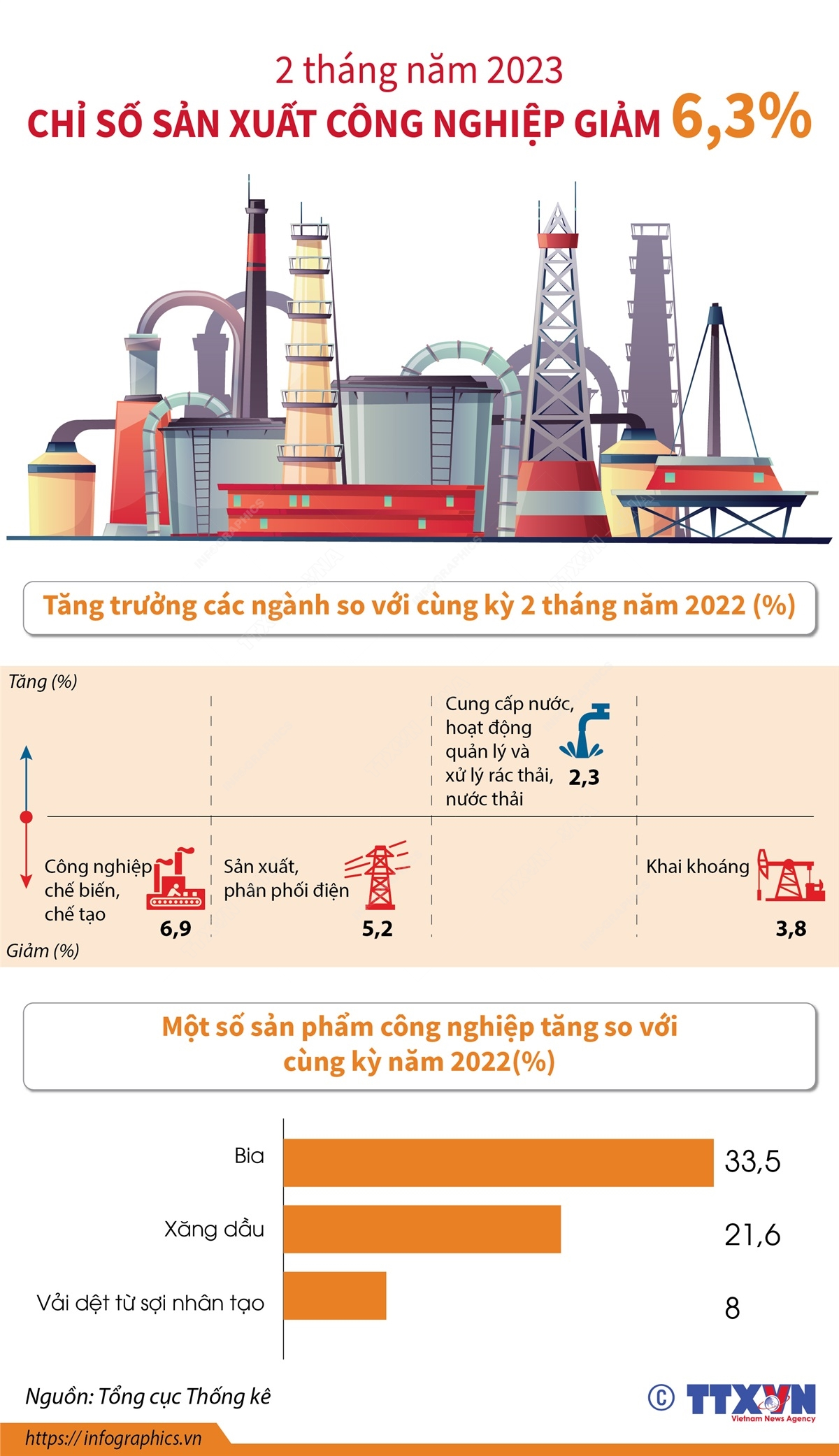 Chỉ số sản xuất công nghiệp 2 tháng năm 2023 giảm 6,3% so với cùng kỳ năm 2022. Trong đó, ngành khai khoáng giảm 3,8%; ngành chế biến, chế tạo giảm 6,9%; ngành sản xuất và phân phối điện giảm 5,2%; riêng ngành cung cấp nước, hoạt động quản lý và xử lý rác thải, nước thải tăng 2,3%.