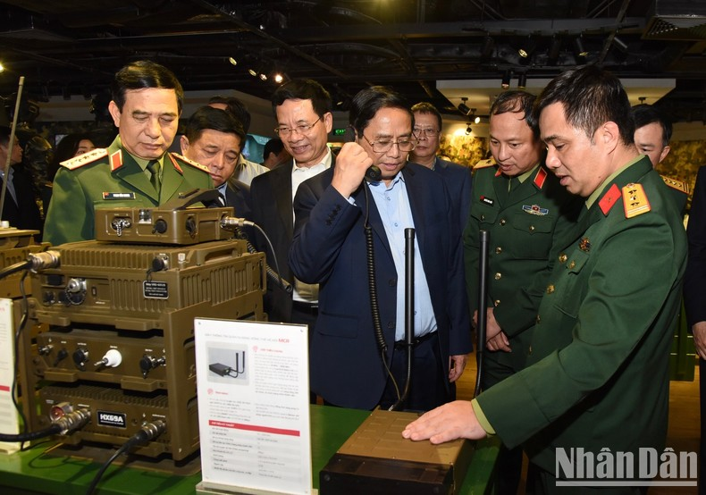 Thủ tướng Phạm Minh Chính và các đại biểu tham quan các sản phẩm công nghệ cao của Viettel.