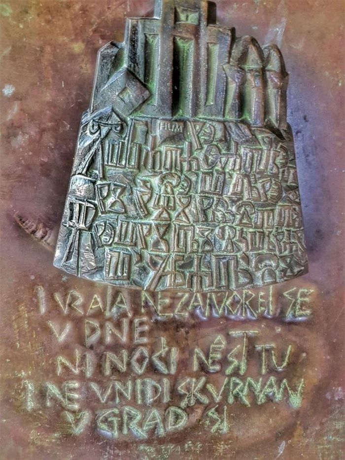 Con đường được trang trí bằng những tác phẩm điêu khắc bằng đá khổng lồ mang chữ viết Glagolitic của Croatia.
