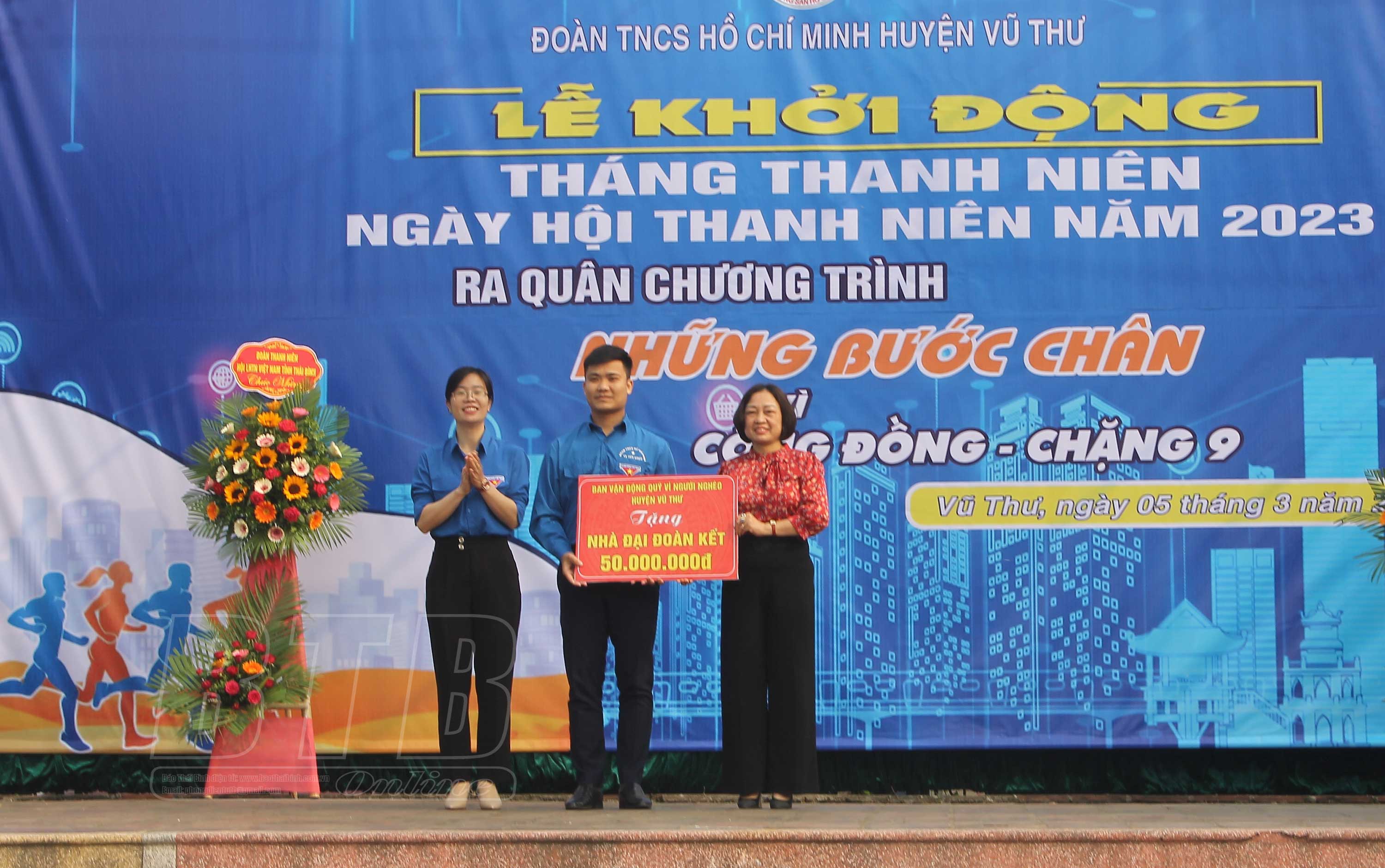 Nhân dịp này, lãnh đạo Tỉnh đoàn đã trao tặng biển công trình “thắp sáng đường quê” cho Huyện đoàn Vũ Thư. Các biển công trình “nhà đại đoàn kết”, “an sinh xã hội”, “sơn nhà” cũng được Ủy ban MTTQ huyện và Huyện đoàn trao cho các tổ chức đoàn cơ sở nhằm giúp đỡ đoàn viên có hoàn cảnh khó khăn.