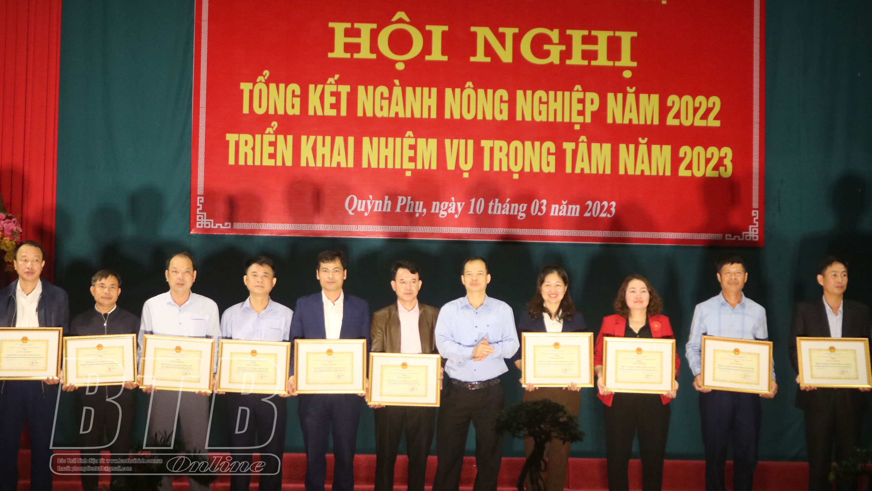 Lãnh đạo huyện Quỳnh Phụ khen thưởng các tập thể có nhiều đóng góp trong sản xuất ngành nông nghiệp của huyện năm 2022.