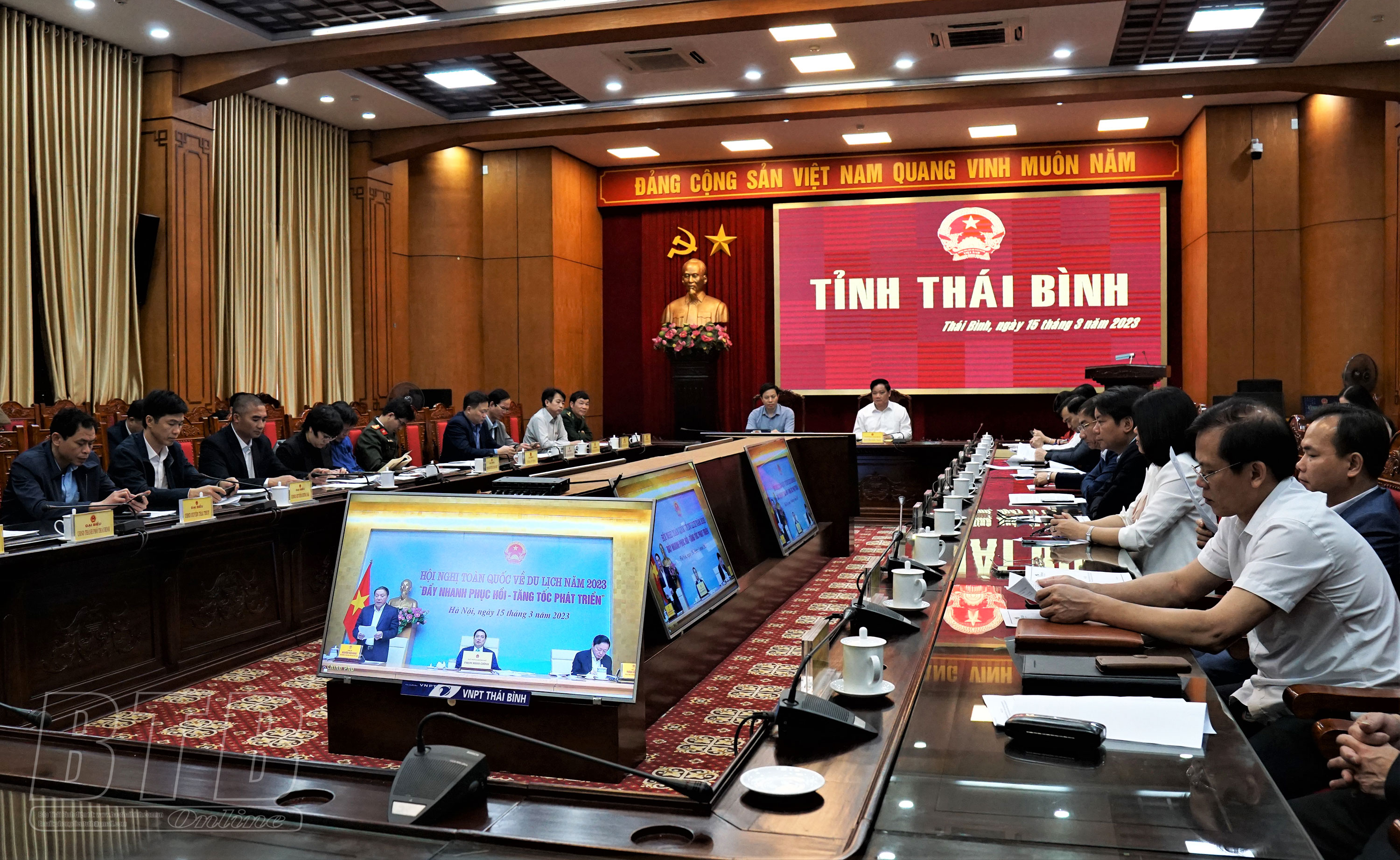 Sáng ngày 15/3, Thủ tướng Chính phủ Phạm Minh Chính chủ trì hội nghị trực tuyến toàn quốc về du lịch năm 2023 với chủ đề Đẩy nhanh phục hồi – Tăng tốc phát triển. Cùng dự có Phó Thủ tướng Trần Hồng Hà; lãnh đạo các bộ, ngành, 63 tỉnh, thành phố và các hiệp hội, doanh nghiệp về du lịch, các hãng hàng không. Dự hội nghị tại điểm cầu tỉnh Thái Bình có các đồng chí: Nguyễn Khắc Thận, Phó Bí thư Tỉnh ủy, Chủ tịch UBND tỉnh; Lại Văn Hoàn, Tỉnh ủy viên, Phó Chủ tịch UBND tỉnh.