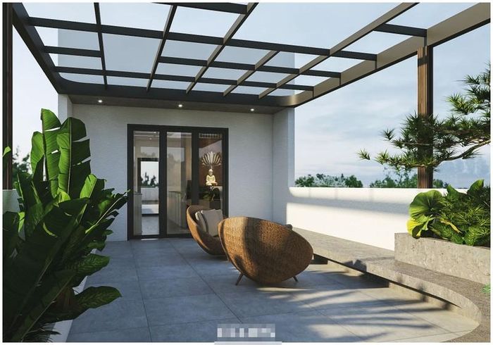 Sân vườn ban công cho cả nhà chill. Hệ ghế dài bằng bê tông dẻo vừa có thể ngồi nghỉ ngơi lại thay bàn trà. Phần mái che tận dụng thành giàn cho cây leo, phía trên là kính để tránh mưa ướt.