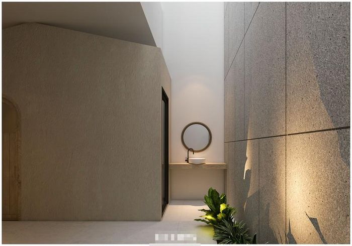 Những mảng tường nhám giúp tiêu âm khi hút gió từ giếng trời xuống, đồng thời tạo hiệu ứng đặc biệt cho thị giác. Ở đây còn có 1 phòng kho đựng đồ đạc ít dùng của gia chủ.