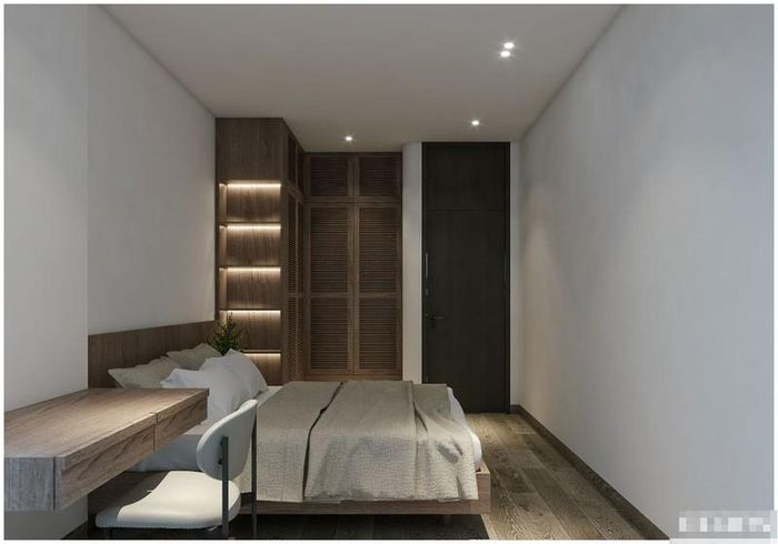 Phòng ngủ có cửa ban công hướng ra giếng trời nên vừa có nhiều ánh sáng, khí tươi lại xử lý được các yếu tố khí hậu mát mẻ bên trong.