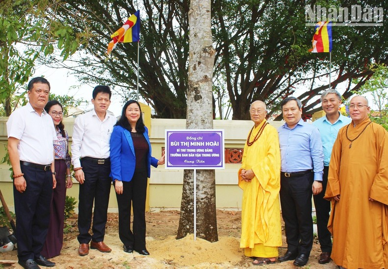 Đồng chí Bùi Thị Minh Hoài trồng cây tại chùa Đại Giác, thành phố Đồng Hới.