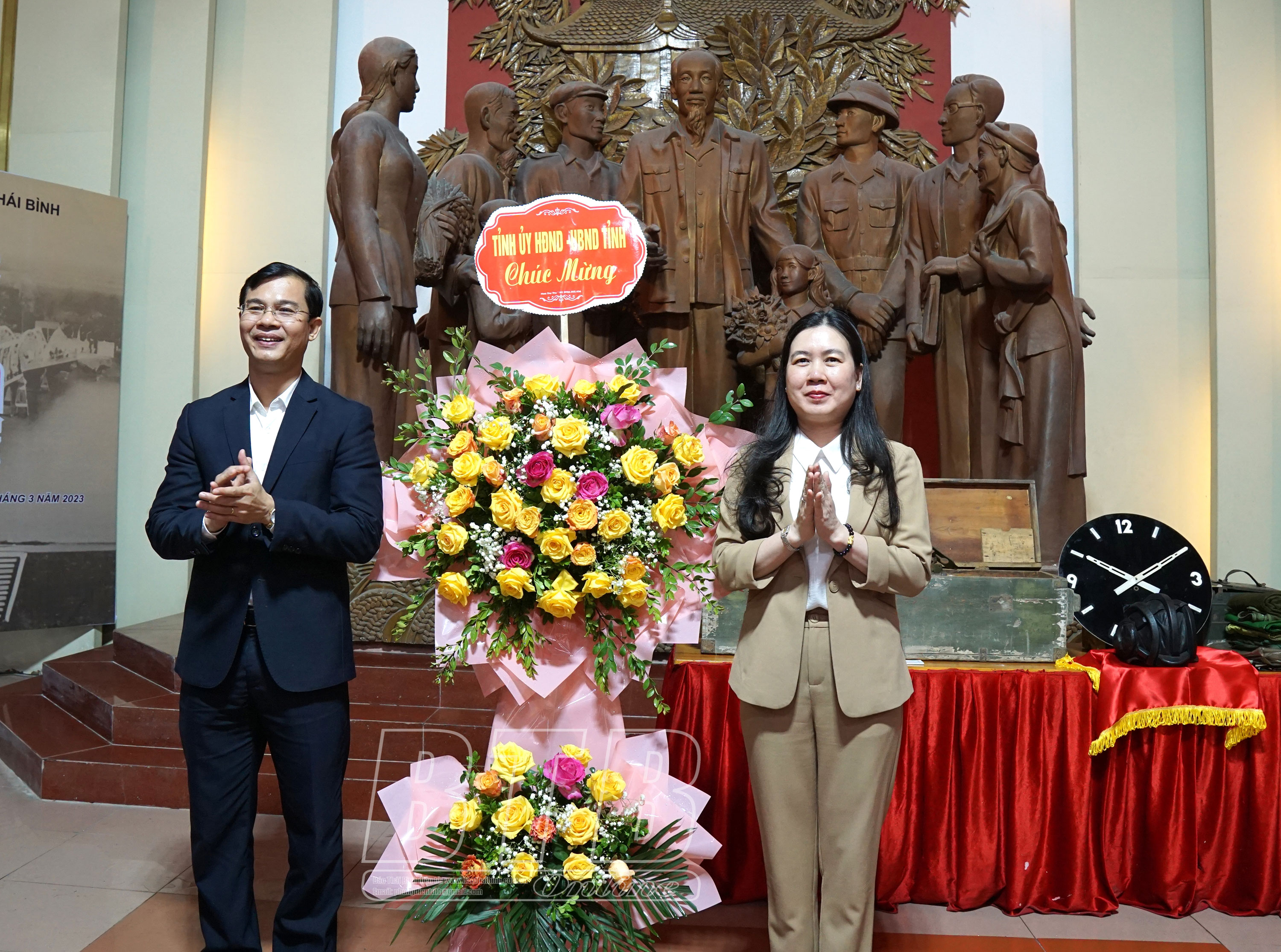 Đồng chí Trần Thị Bích Hằng, Tỉnh ủy viên, Phó Chủ tịch UBND tỉnh chúc mừng khai mạc trưng bày chuyên đề Thái Bình trong dòng chảy lịch sử.
