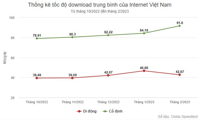Theo bảng xếp hạng Speedtest Global Index vừa được Ookla công bố, tốc độ Internet tại Việt Nam có sự thay đổi mạnh. Mạng băng rộng cố định đạt tốc độ tải xuống 91,6 Mbps, tăng gần 9% so với mức 84,18 Mbps của tháng trước đó, thậm chí là tốc độ cao nhất từ trước đến nay. Trong khi đó, mạng di động giảm từ 46,66 Mbps trong tháng 1 xuống 42,67 trong tháng 2.