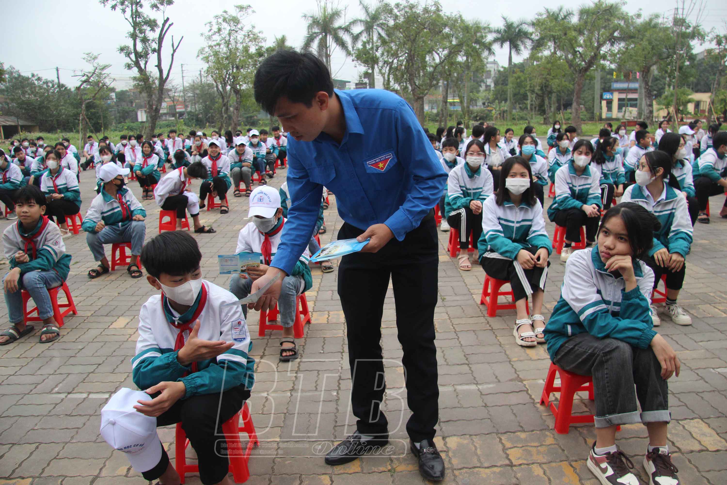 Đoàn Thanh niên thị trấn Tiền Hải phát tờ rơi tuyên truyền về chăm sóc sức khỏe sinh sản vị thành niên tại Trường THCS Nguyễn Công Trứ.