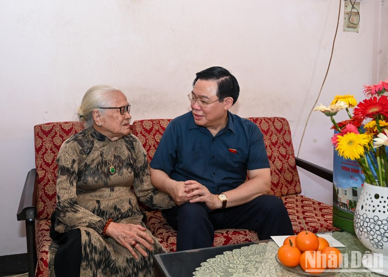 Chủ tịch Quốc hội Vương Đình Huệ thăm hỏi mẹ liệt sĩ Nghiêm Thị Thân tại phường Đức Thắng, thành phố Phan Thiết. (Ảnh: DUY LINH).