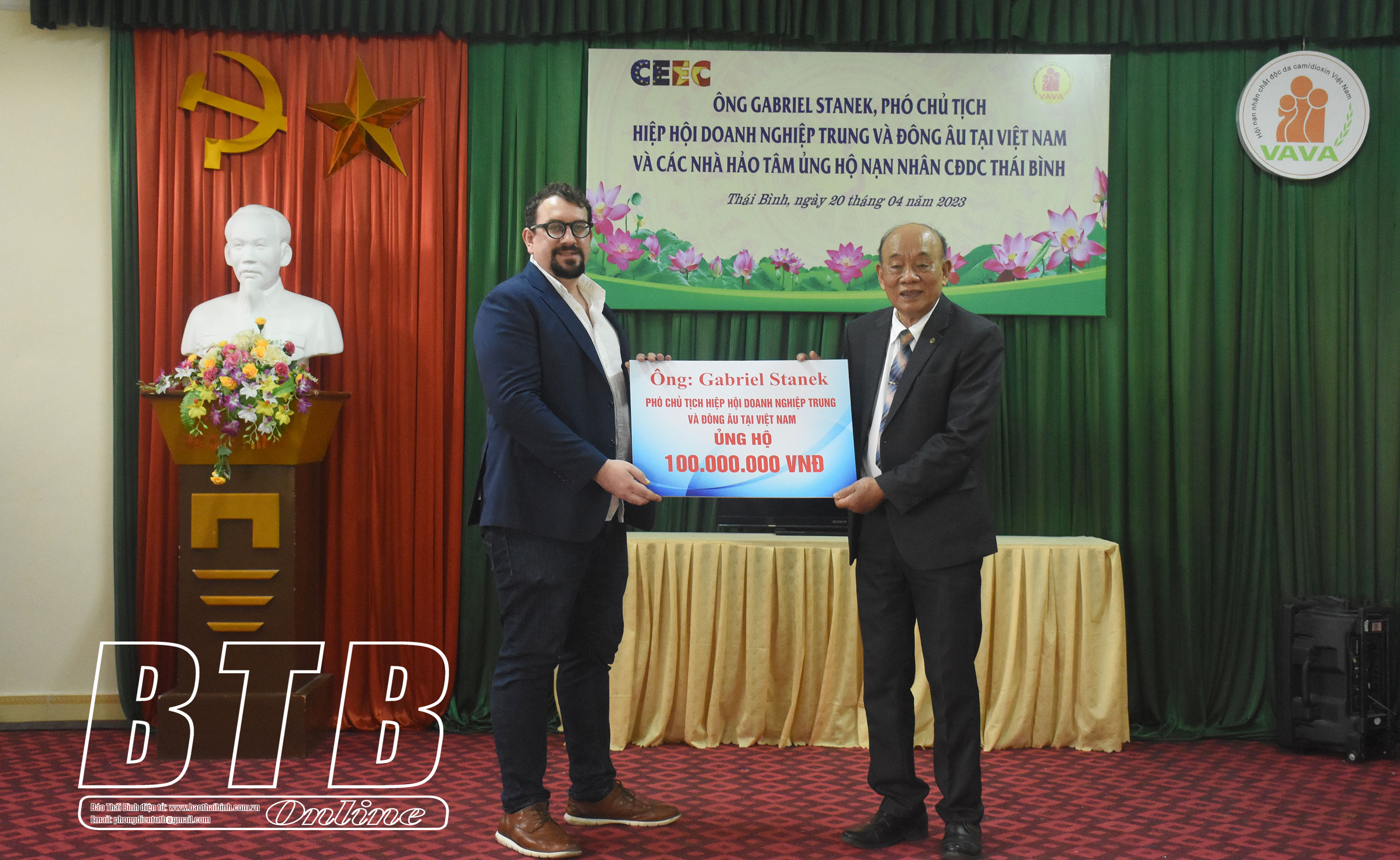 Ông Gabriel Stanek, Phó Chủ tịch Hiệp hội Doanh nghiệp Trung và Đông Âu tại Việt Nam ủng hộ 100 triệu đồng cho Quỹ nạn nhân chất độc da cam/Điôxin tỉnh Thái Bình.