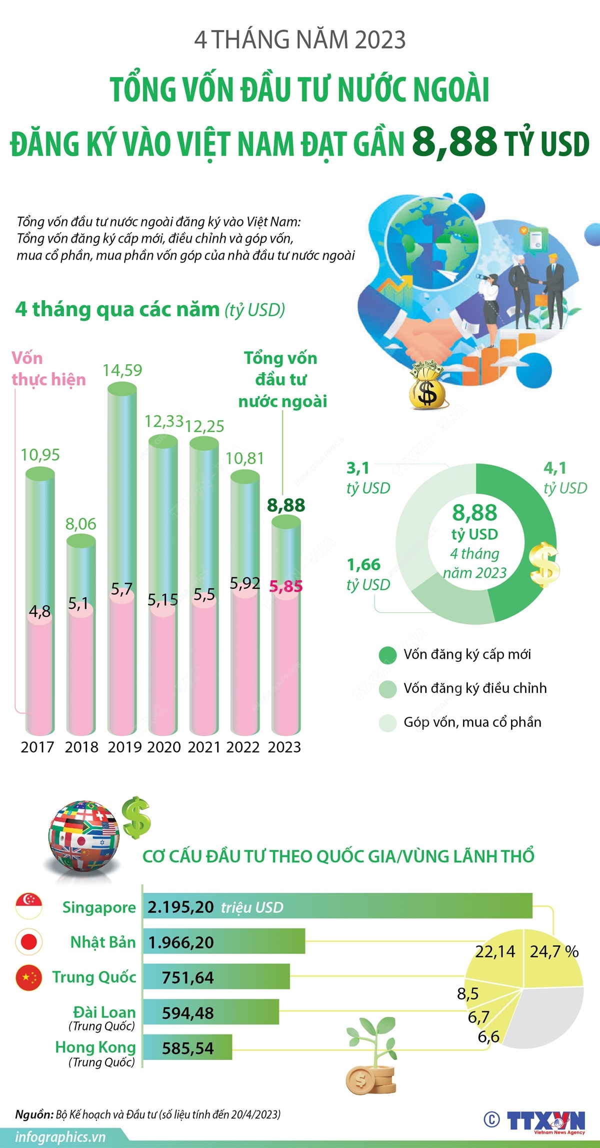 Tính đến ngày 20/4/2023, tổng vốn đăng ký cấp mới, điều chỉnh và góp vốn mua cổ phần, mua phần vốn góp của nhà đầu tư nước ngoài vào Việt Nam đạt gần 8,88 tỷ USD, bằng 82,1% so với cùng kỳ năm 2022.