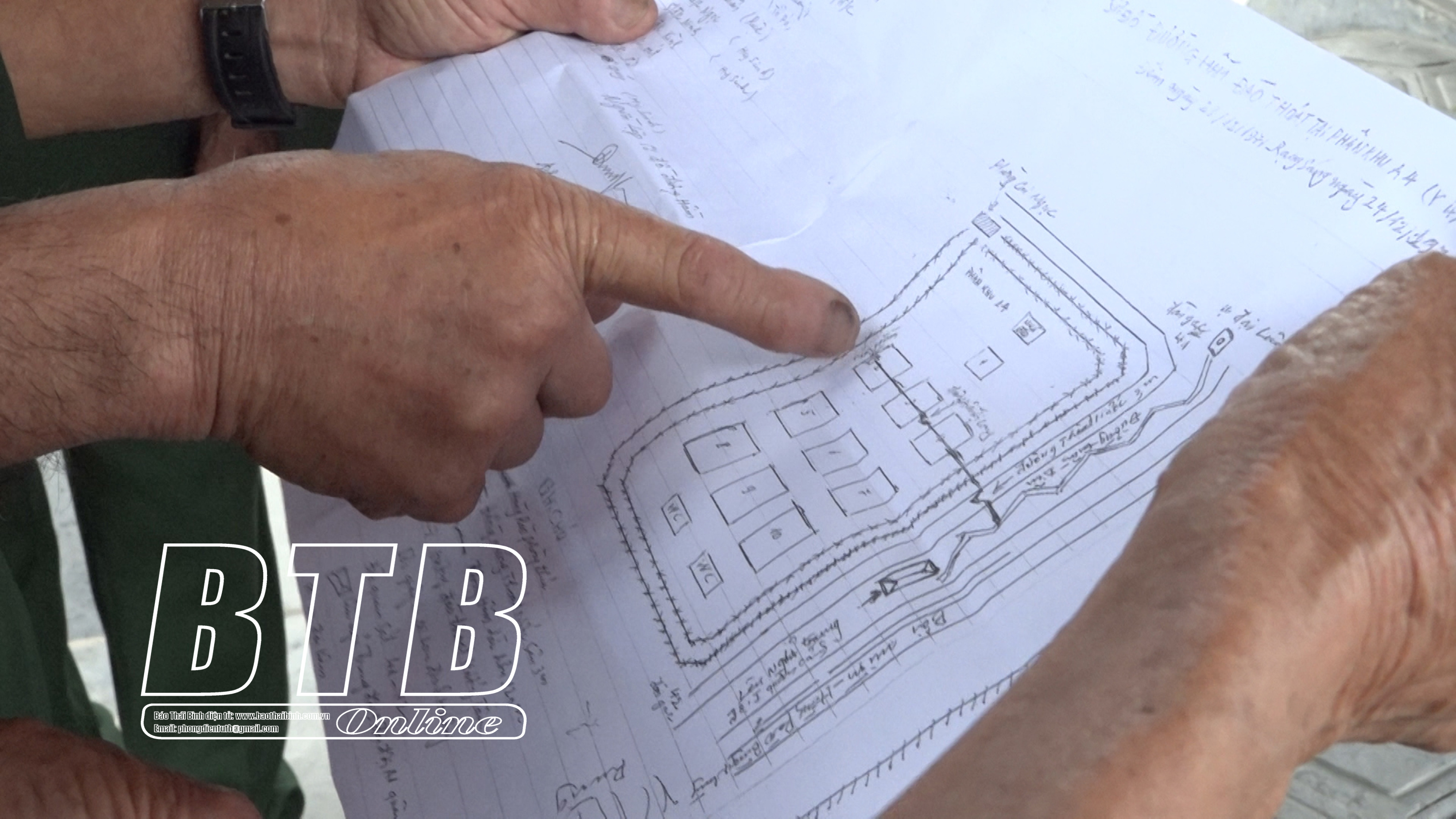 Cựu chiến binh Phạm Quang Ruệ giới thiệu sơ đồ hầm vượt ngục ở Nhà tù Phú Quốc do chính tay ông vẽ lại.