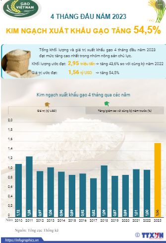 Theo Bộ Nông nghiệp và Phát triển nông thôn, tổng khối lượng và giá trị xuất khẩu gạo trong 4 tháng đầu năm 2023, đạt mức tăng cao nhất trong nhóm nông sản chủ lực. Cụ thể, khối lượng và giá trị xuất khẩu gạo ước đạt 2,95 triệu tấn với 1,56 tỷ USD, tăng 43,6% về khối lượng và tăng 54,5% về giá trị so với cùng kỳ năm 2022. Một số mặt hàng nông sản khác cũng có giá trị xuất khẩu cao hơn cùng kỳ năm ngoái như cà phê tăng 2,5% hạt điều tăng 3,4% rau quả tăng 19,4%.