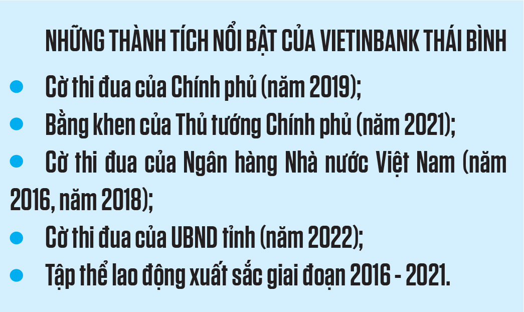 Cùng với chú trọng tăng trưởng tín dụng, VietinBank Thái Bình còn là đơn vị đi đầu triển khai thực hiện các chương trình, chính sách ưu đãi của Chính phủ, của ngành và của tỉnh như: hỗ trợ 2% lãi suất theo Nghị định số 31/2022/NĐ-CP với dư nợ 48,5 tỷ đồng, triển khai gói cho vay nhà ở xã hội tới 60 khách hàng với dư nợ hơn 15 tỷ đồng, giảm lãi suất cho vay hỗ trợ khách hàng bị ảnh hưởng bởi dịch Covid-19 với doanh số cho vay khoảng 1.000 tỷ đồng... Trong hoạt động thanh toán, thông qua việc chú trọng phát triển các dịch vụ ngân hàng số, thanh toán số, đổi mới tiện ích, ứng dụng các công nghệ tiên tiến để nâng cao hiệu quả hoạt động và chất lượng dịch vụ, VietinBank Thái Bình đã trở thành một trong những đơn vị dẫn đầu toàn tỉnh về công tác thanh toán xuất nhập khẩu với doanh số thanh toán chiếm 15% doanh số thanh toán xuất nhập khẩu toàn ngành.