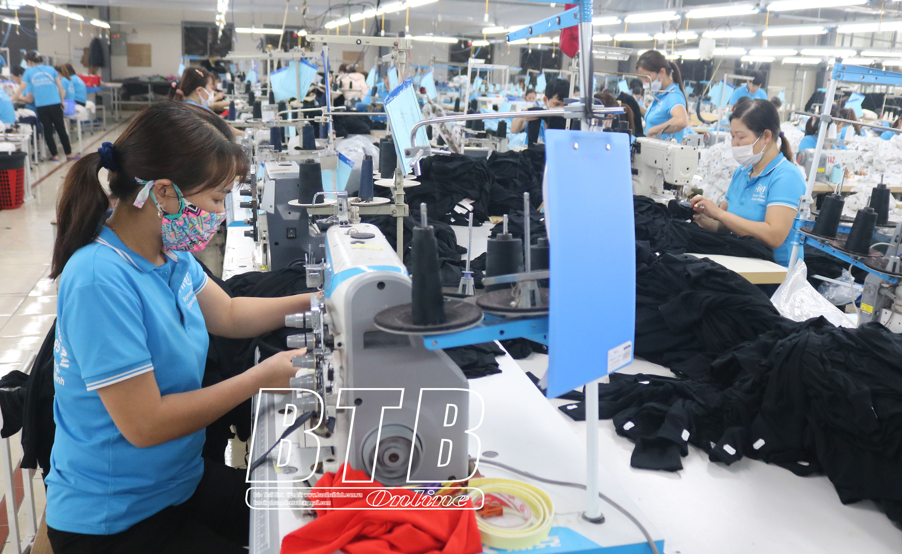 Người lao động tại doanh nghiệp trên địa bàn huyện Quỳnh Phụ thực hiện nghiêm các biện pháp phòng, chống dịch Covid-19.