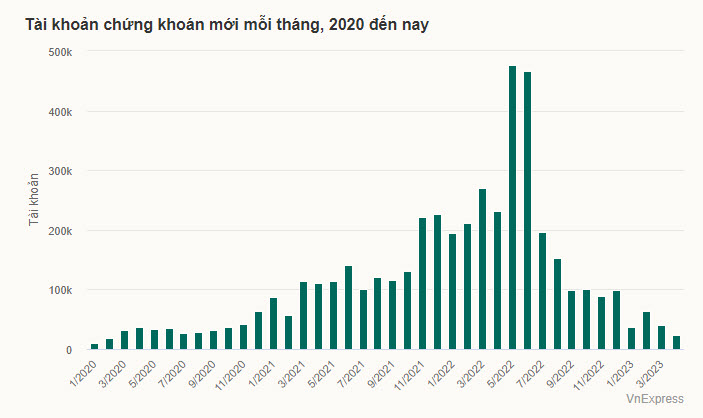 Ở những giai đoạn bùng nổ về điểm số và thanh khoản, cộng thêm các công ty chứng khoán liên tục ra chính sách hút nhà đầu tư mới, lượng đăng ký mỗi tháng thường dao động 200.00-450.000 tài khoản. Tuy nhiên, từ giữa năm 2022, con số này giảm mạnh về dưới 100.000 tài khoản, tiếp tục giảm thêm trong đầu năm nay. Bình quân bốn tháng đầu năm 2023, tài khoản chứng khoán mở mới mỗi tháng chỉ hơn 40.000 tài khoản.