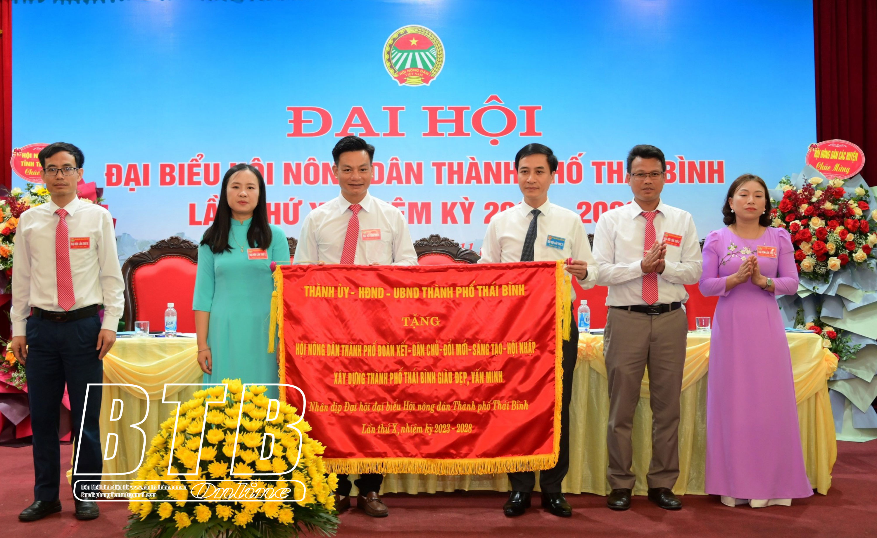Lãnh đạo Thành ủy Thái Bình tặng bức trướng cho Hội Nông dân thành phố.