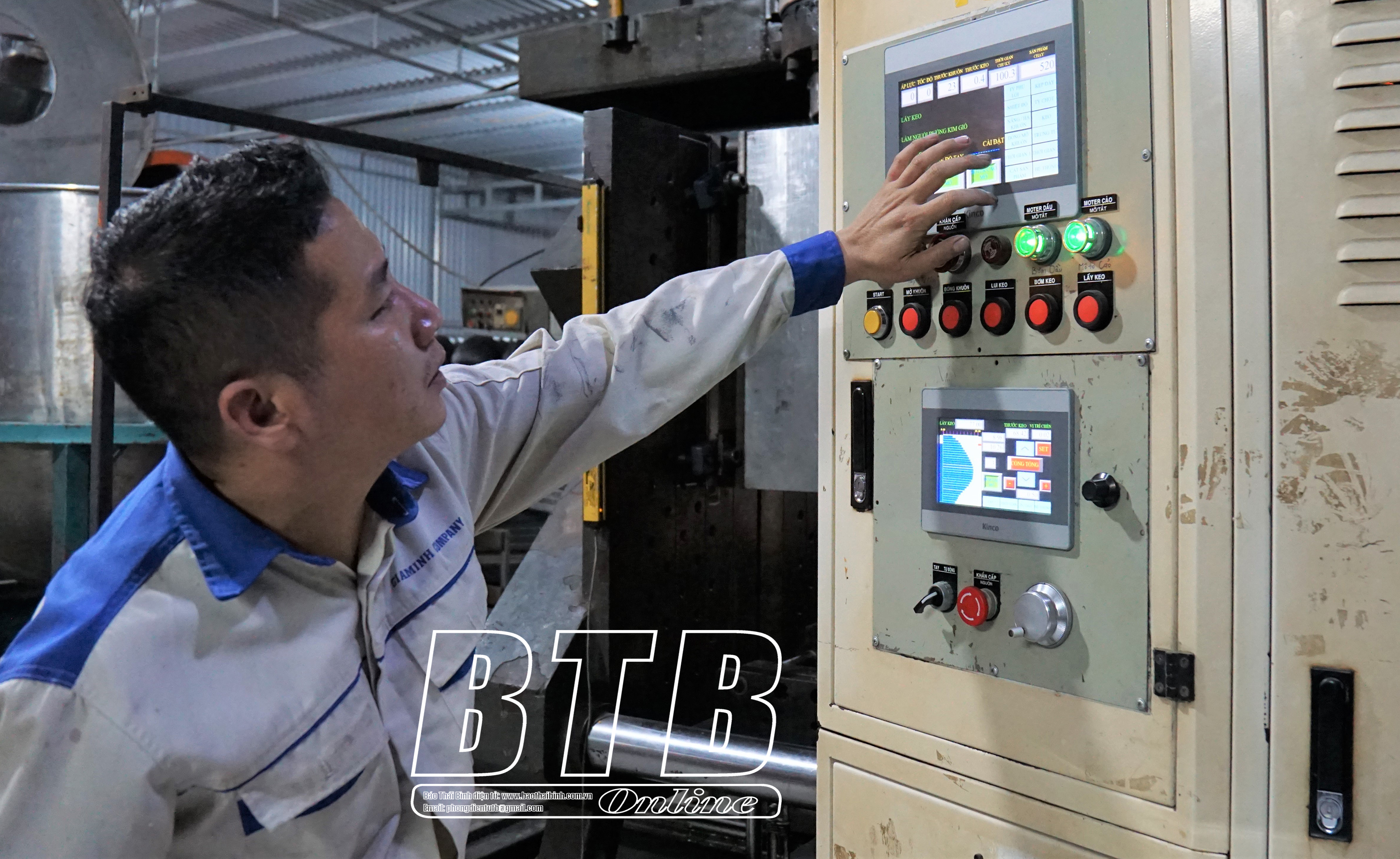 Anh Khiếu Công Chẩn điều khiển máy móc tại xưởng cơ khí chế tạo, sản xuất các sản phẩm nhựa của mình.