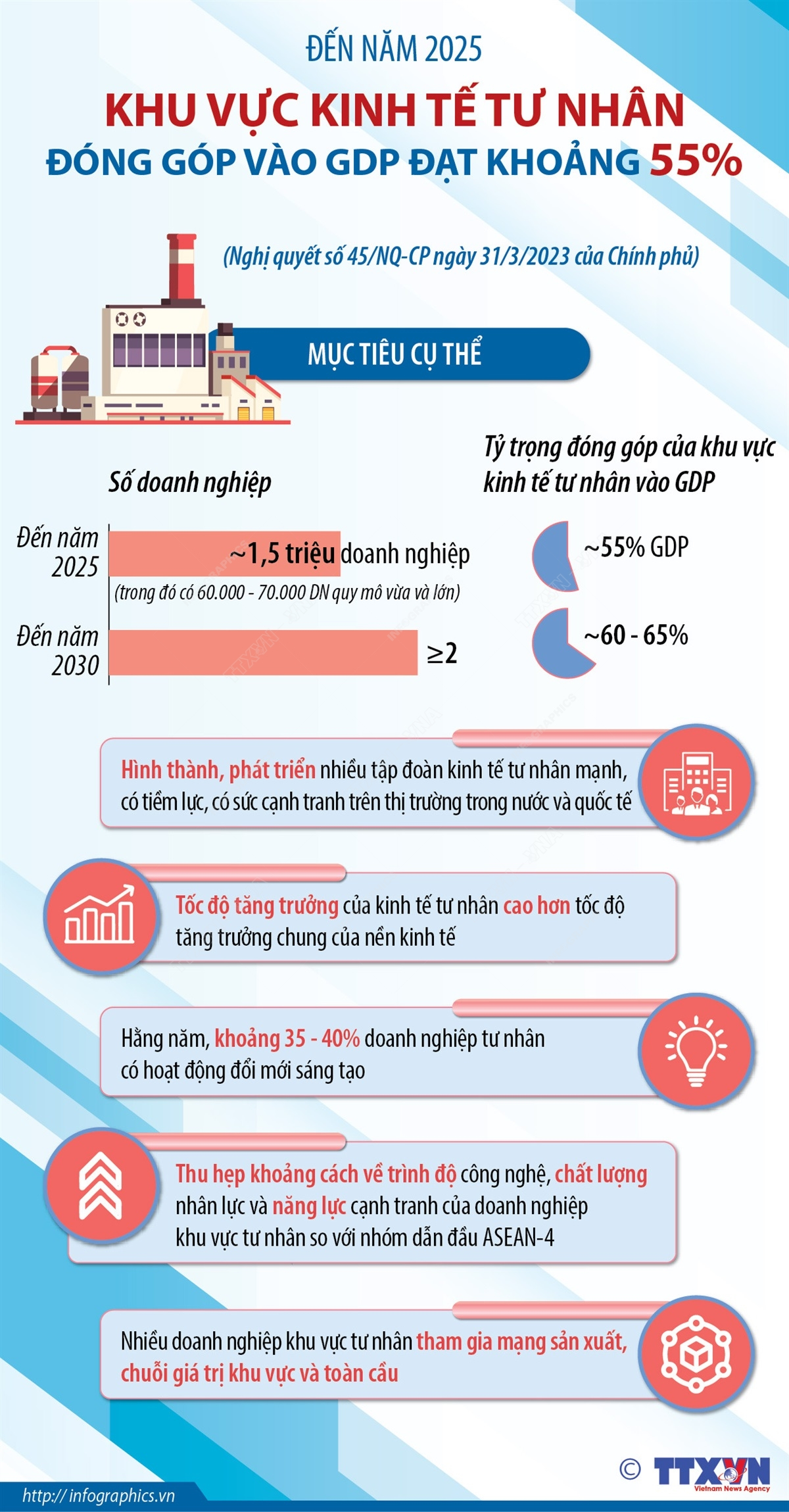 Để phát triển kinh tế tư nhân thực sự trở thành một động lực quan trọng của nền kinh tế thị trường định hướng xã hội chủ nghĩa, góp phần phát triển kinh tế-xã hội nhanh, bền vững, nâng cao tính tự chủ, tự cường của nền kinh tế, Nghị quyết số 45/NQ-CP ngày 31/3/2023 của Chính phủ đề ra mục tiêu đến năm 2025, cả nước có khoảng 1,5 triệu doanh nghiệp, trong đó có 60.000 đến 70.000 doanh nghiệp quy mô vừa và lớn đến năm 2030 có ít nhất 2 triệu doanh nghiệp. Phấn đấu tăng tỷ trọng đóng góp của khu vực kinh tế tư nhân vào GDP để đến năm 2025 đạt khoảng 55% đến năm 2030 khoảng 60 - 65% GDP.