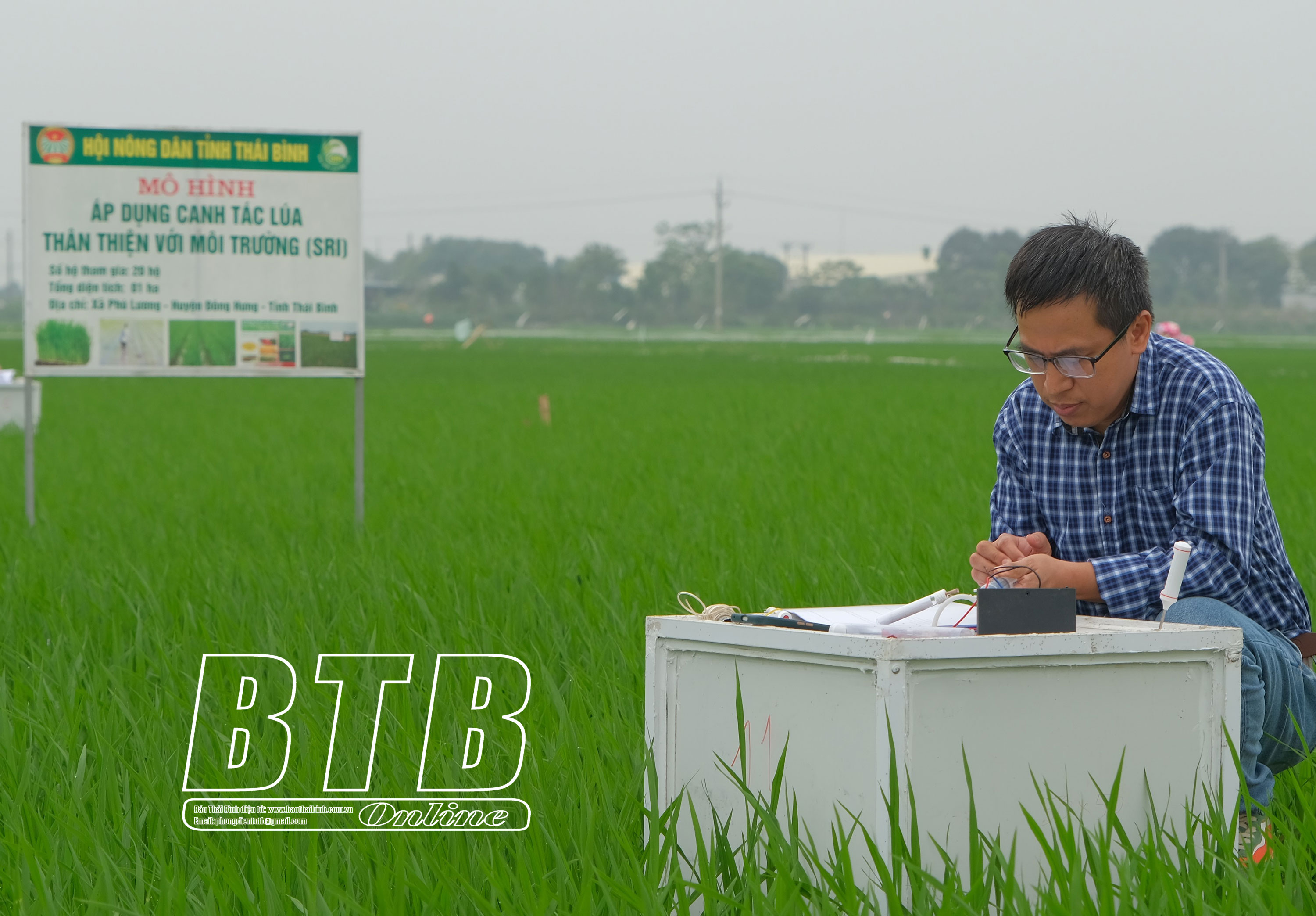 Chuyên gia đo phát thải nhà kính trong canh tác lúa tại xã Phú Lương (Đông Hưng).