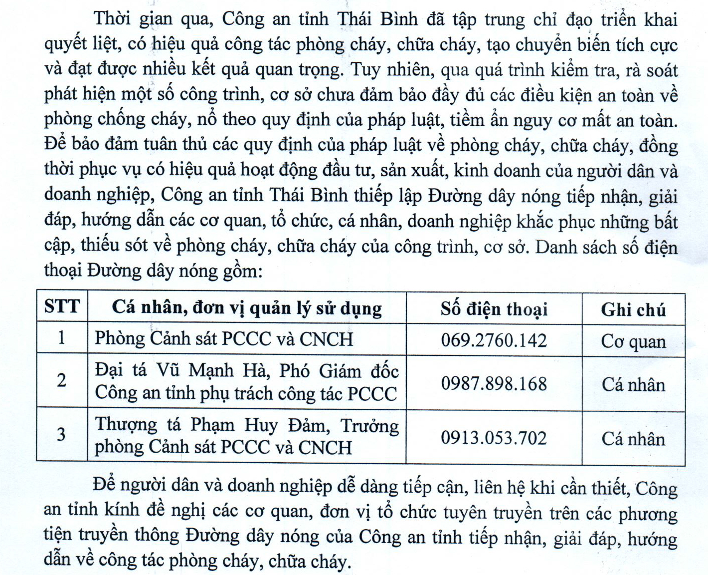 Công bố đường dây nóng của Công an tỉnh Thái Bình tiếp nhận, giải đáp hướng dẫn về công tác PCCC