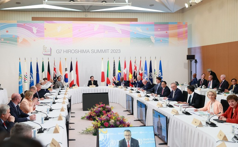 Trong phát biểu quan trọng tại phiên họp, Thủ tướng Phạm Minh Chính trân trọng cảm ơn Chính phủ Nhật Bản và Thủ tướng Kishida Fumio về những tình cảm tốt đẹp, sự hiếu khách và tổ chức, thu xếp hết sức chu đáo cho Hội nghị G7 mở rộng.