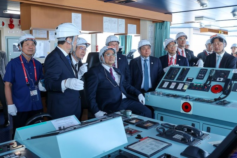 * Cũng trong sáng nay, tại Hiroshima, Thủ tướng Phạm Minh Chính và các nhà lãnh đạo đã đi tham quan con tàu vận chuyển hydro lỏng đầu tiên trên thế giới mang tên “Suiso Frontier”, được hoàn thành với sự hỗ trợ của Bộ Kinh tế, Thương mại và Công nghiệp Nhật Bản.