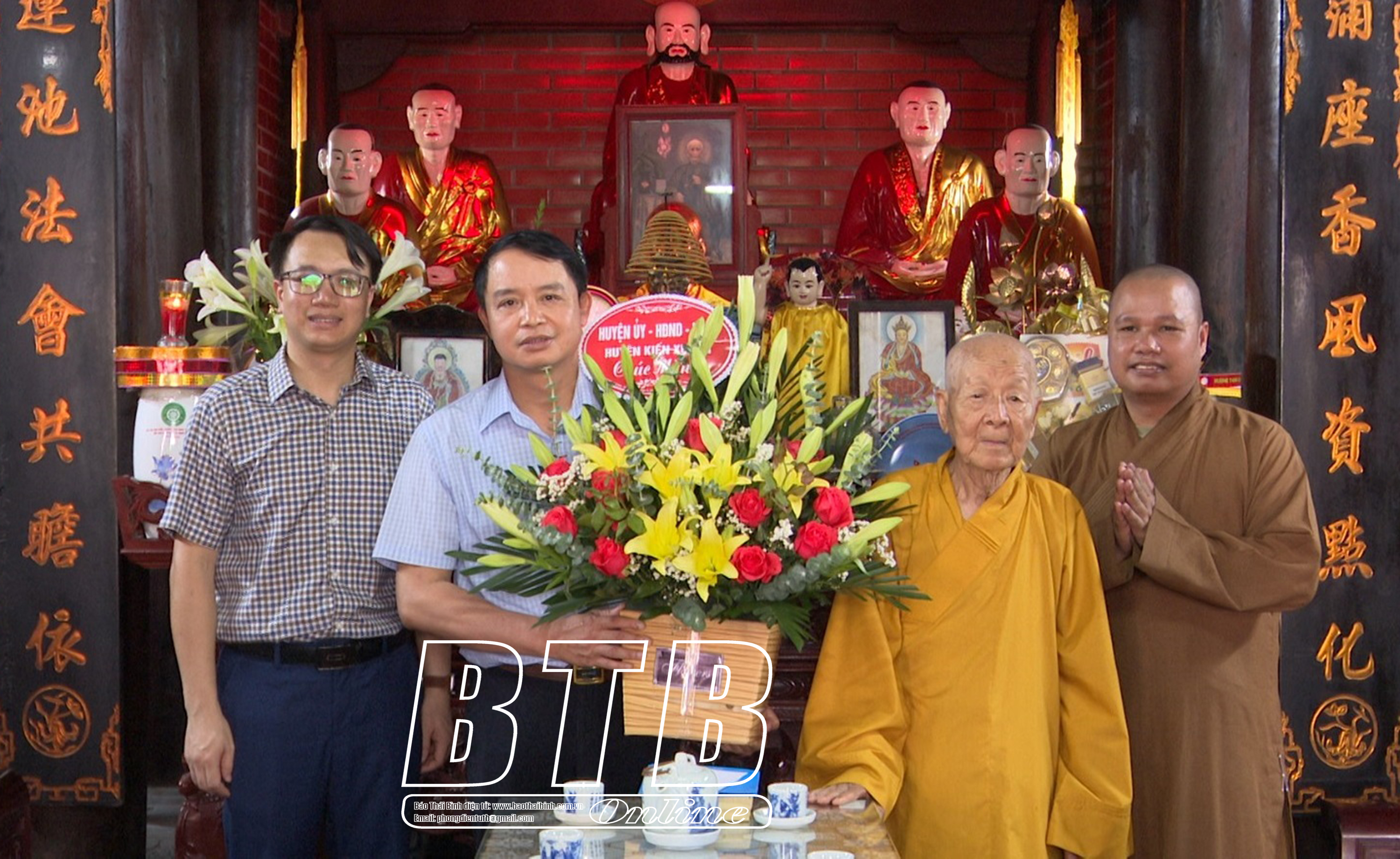 Đồng chí Nguyễn Văn Giang, Ủy viên Ban Thường vụ, Trưởng ban Dân vận Tỉnh ủy tặng hoa chúc mừng Hòa thượng Thích Thanh Dục. Các đồng chí lãnh đạo huyện Kiến Xương tặng hoa chúc mừng Hòa thượng Thích Thanh Dục.