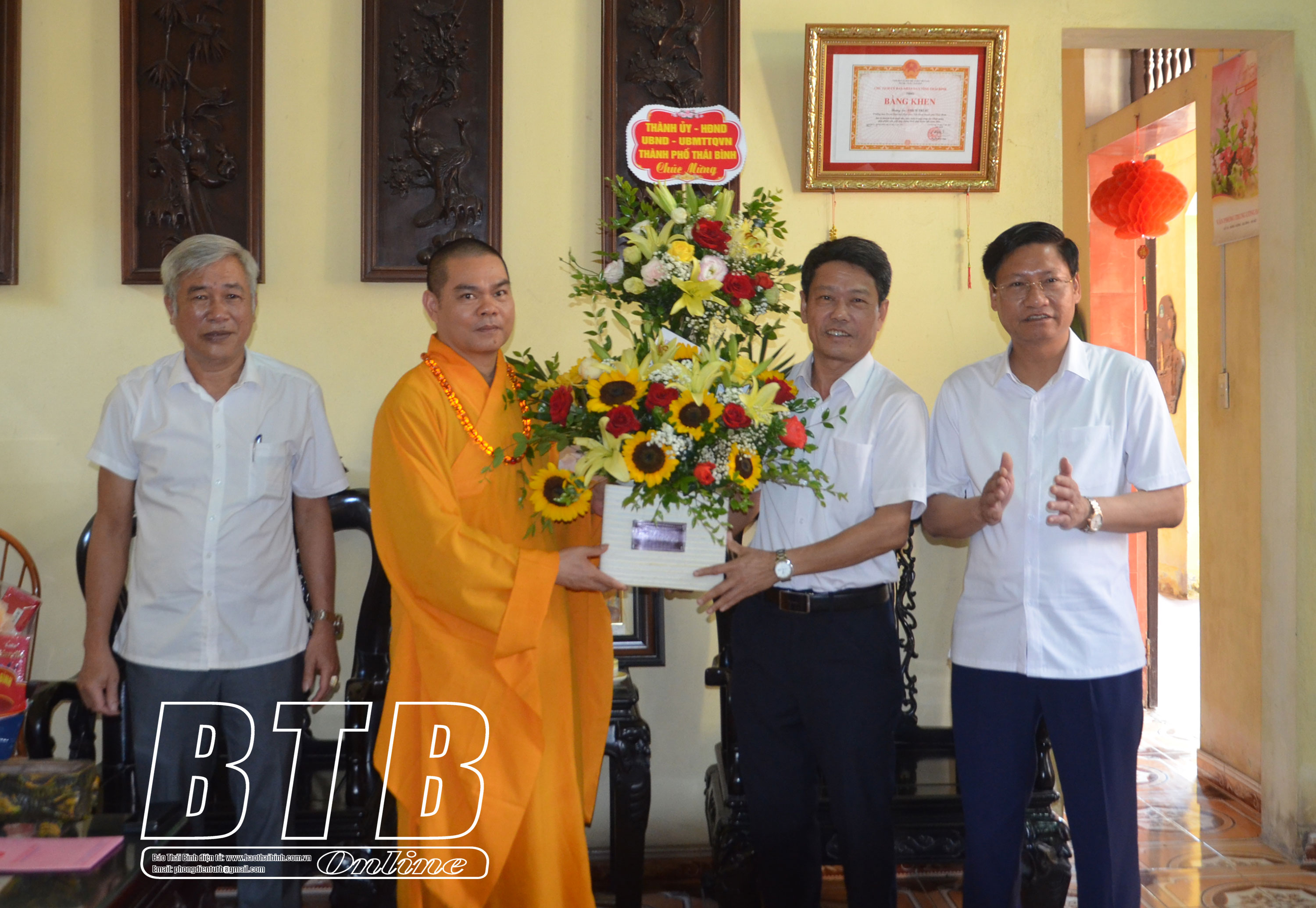 Lãnh đạo Thành ủy, UBND thành phố Thái Bình tặng hoa chúc mừng Thượng tọa Thích Trí Sử.